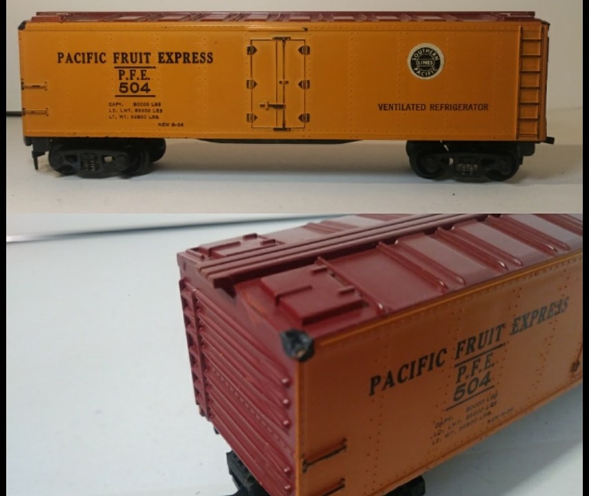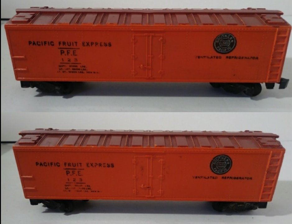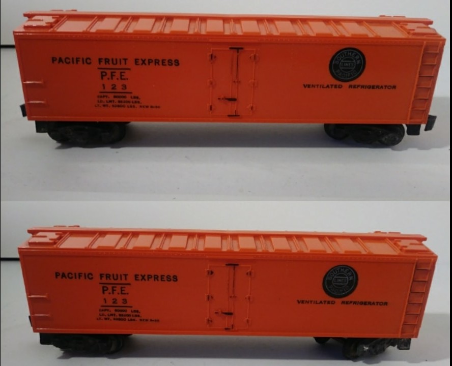 5) RARE uncataloged early postwar all orange 123 PFE reefer in near perfect condition. Hard pressed to find one nicer, $115