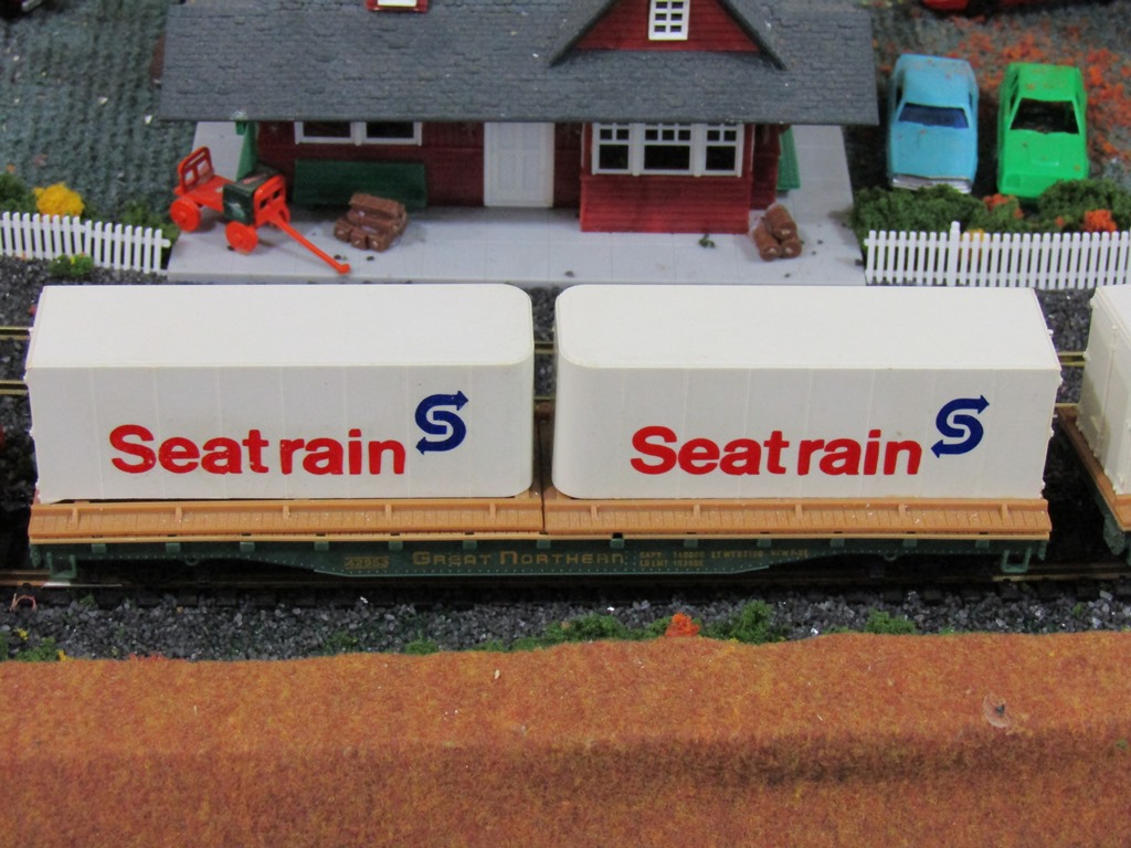 This car was part of an Ebay find last Tuesday night - "Brown Box Era" Sea Train container car, complete with brake wheel, which is now part of a short freight haul on the outer line.