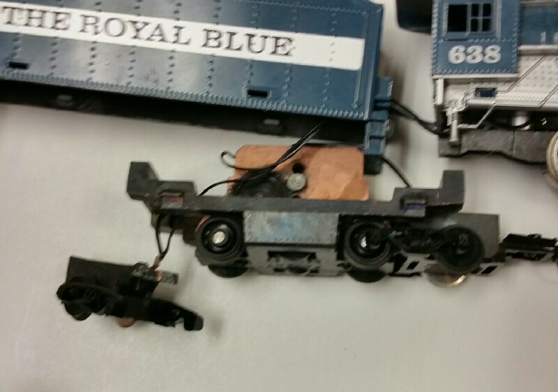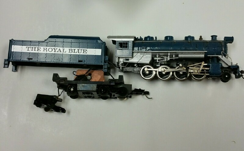 Was working on a shop engine from a a big lot of HO, and this nice looking Tyco Royal Blue looked good to work on. I started on it, and discovered that one of the trucks was locked up. I tried to get the truck removed from the tender frame, and it broke off. I've just recently started working on some Tyco tender drives ( for a guy in Texas ), so don't have much experience with them yet. But I thought the zinc pest problem was long gone from Tyco history when these tender drives came out. I guess not. AT any rate, the train shop gave me the engine for parts, as it's useless to them now. I have a Royal blue myself where the engine was missing parts, so I can probably combine the two to get a running engine and tender. This engine looks fantastic , like it was hardly run. Shame the tender unit had the issue. The other swiveling truck has no issues, it was just the one.