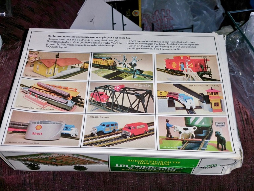 The back side of the box; same as on the boxes for their action accessories of the time. Believe it or not, Bachmann still sells some of their operating accessories in the older late 70s box style from time to time, just with the product number updated. (At the hobby shop I often go to, I've seen the Wayside Steam Whistle Warehouse sold in the original 1980 packaging style, complete with the back showing some of those long-discontinued products. Talk about a throwback!)
