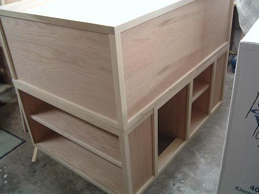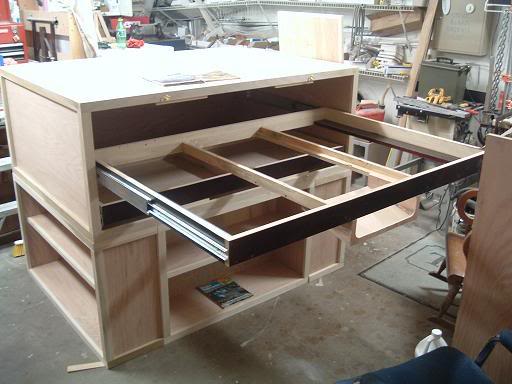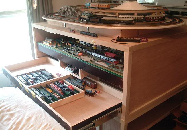 I watch too much "This Old House" and "New Yankee Workshop". The layout sits on a frame that it can be lifted off of. The drawer has a 3 foot long full extension slide. The lower drawer is on a 2 foot set.