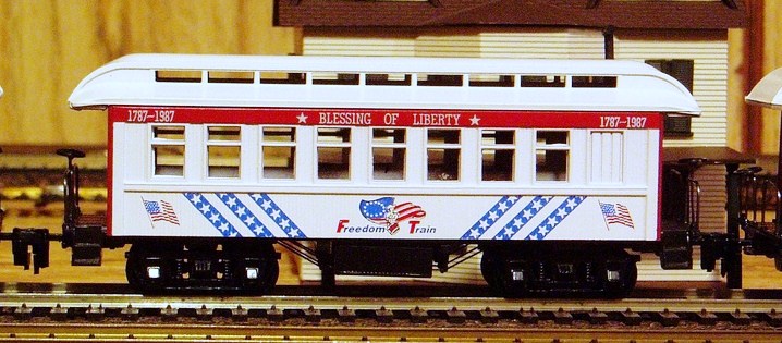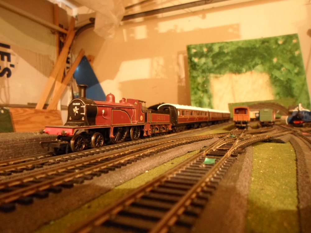 Going back to the Chopchives, this is a Hornby OO scale set. Only the large center driver is powered, so a heavy hauler it is not. The carriages in this set are very light, but for all that it has great detail and runs very well, even through the tightest curves and switches. If there is any slope to the baseboard, it slips badly, so I have to tune the leg heights periodically.
