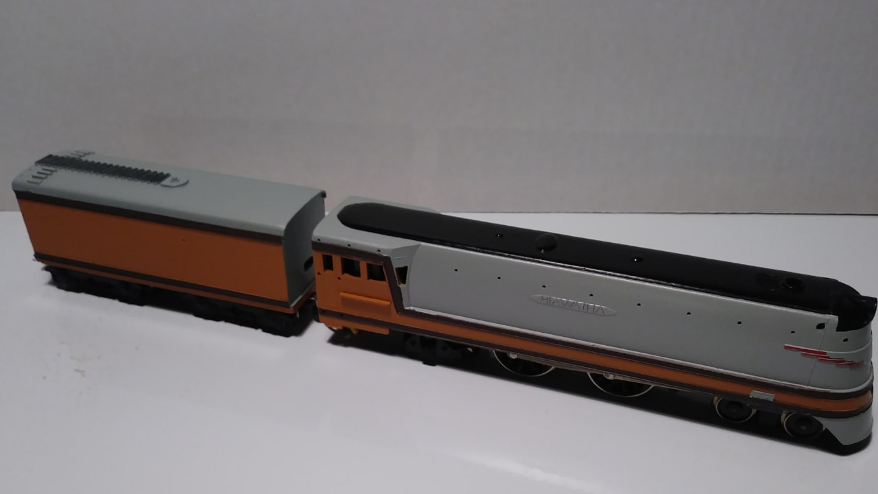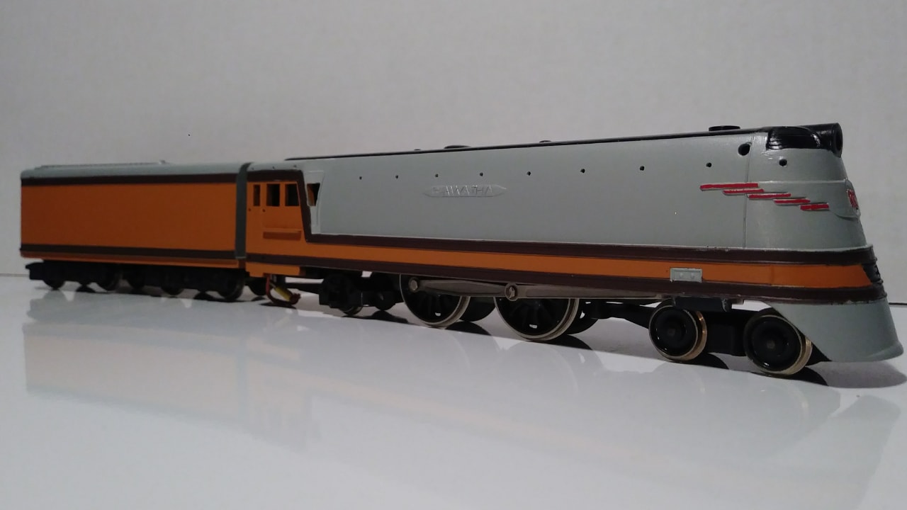 I'll kick off the LOTW this week with my newest addition to my fleet. I scored this Rivarossi SM 442 Hiawatha kit two weeks ago. Although compete, it was refinished in the wrong colors. I stripped the Bakelite shells down and refinished them in the correct color scheme for the Hiawatha. I still have the railings and stanchions to strip and reinstall and i have to make the decals but I'm proud of the newest addition to my collection. The Rivarossi Hiawatha was made from 1948 until 1960 and it is a very scarce engine to find. I have been searching for close to 30 years for an affordable example that was complete and not destroyed from zinc pest which these are prone to.