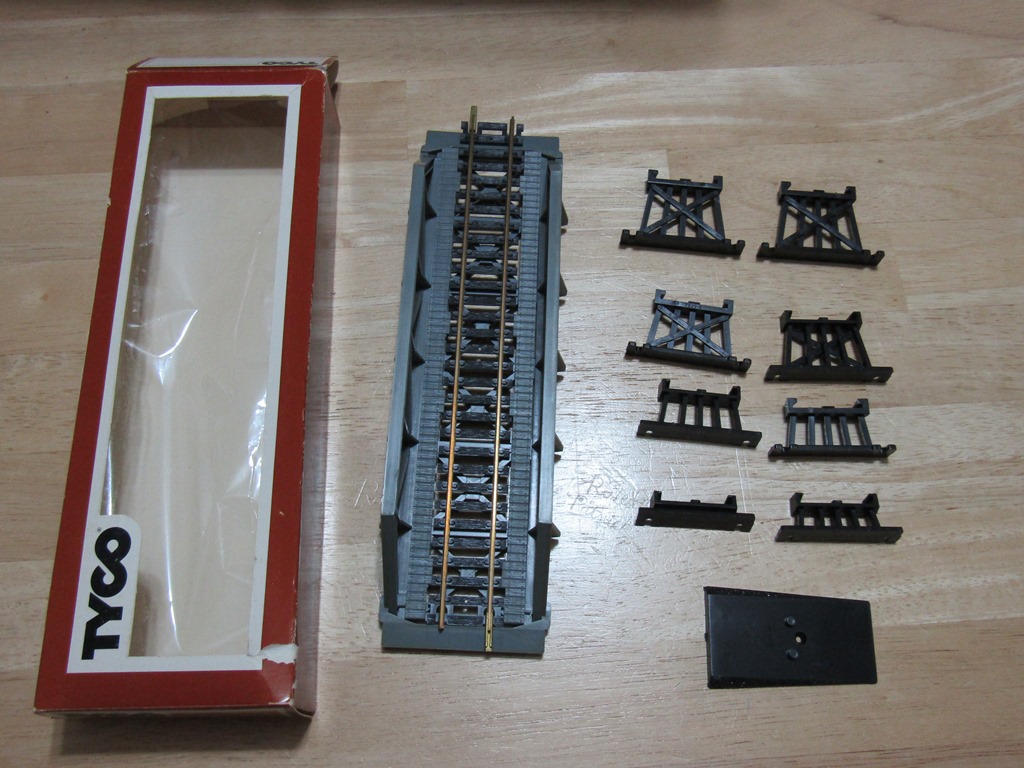 A Tyco Bridge set (incomplete trestle-speaking, but the bridge appears complete and intact - with slight yellowing) Comes with uncataloged box. By the way, I do believe I have spare reddish brown Tyco trestles, if anyone really needs a complete set.