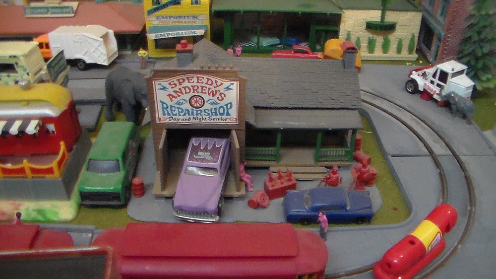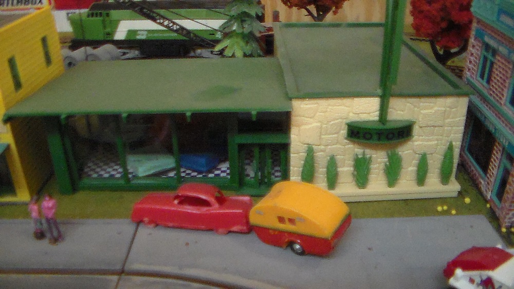 One of my favorite buildings came from RP Model Railroads: this terrifically cheezy car show room on Main Street in Tycoville.