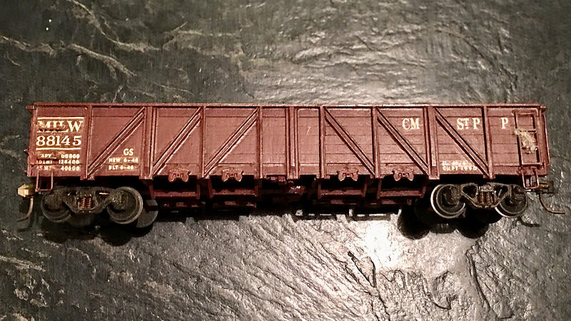 Car is one half of Ambroid's 50th-Anniversary 2-car special kit (Kit 1st #8, made 1960), which built this Milwaukee gon as well as an N&W wooden war-emergency hopper. Very nice!