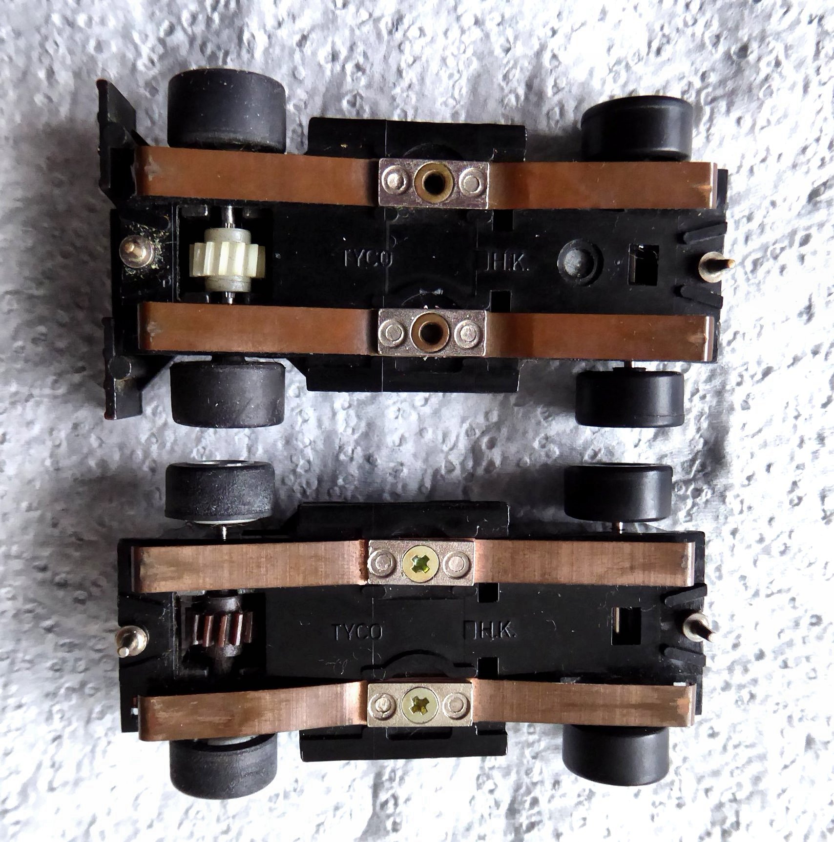 Oh, hang on. The rivetted chassis has a round, stepped, hole about 1/4" back from the square hole at the front end of the chassis and one, or two, 'pips' or dots on the chassis just between the square and round hole. (On their racing chassis, pan or slim, Tyco used such dots and check marks to identify the source and mould different parts of these chassis came from.) I checked Third Wheel and 6-wheeler chassis and it's true of both.
