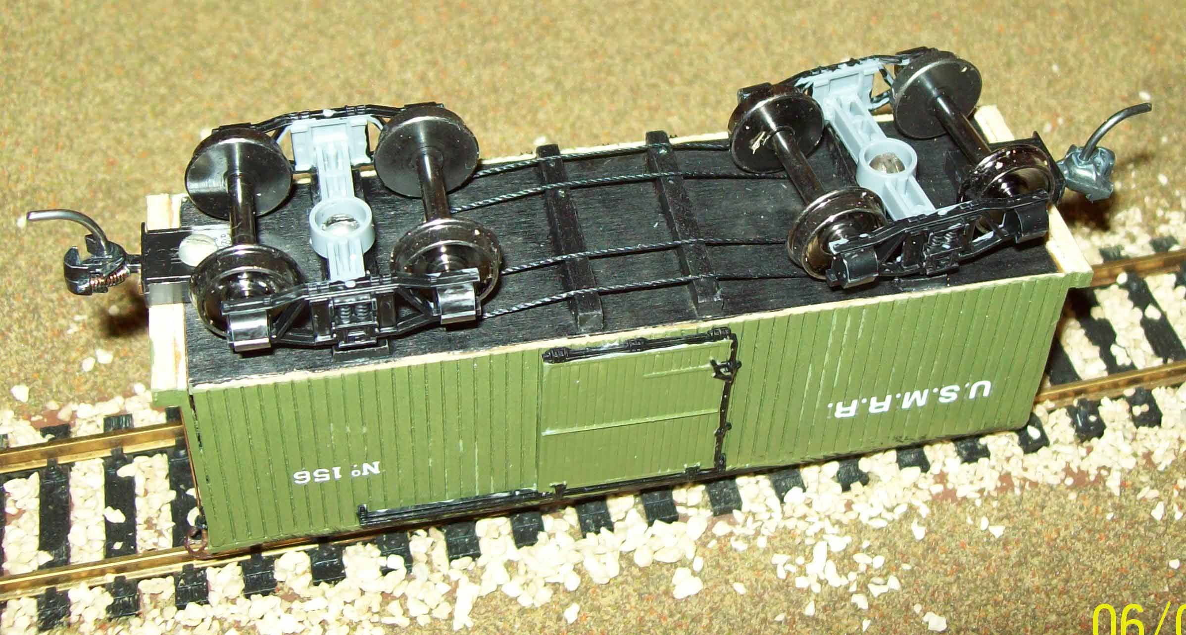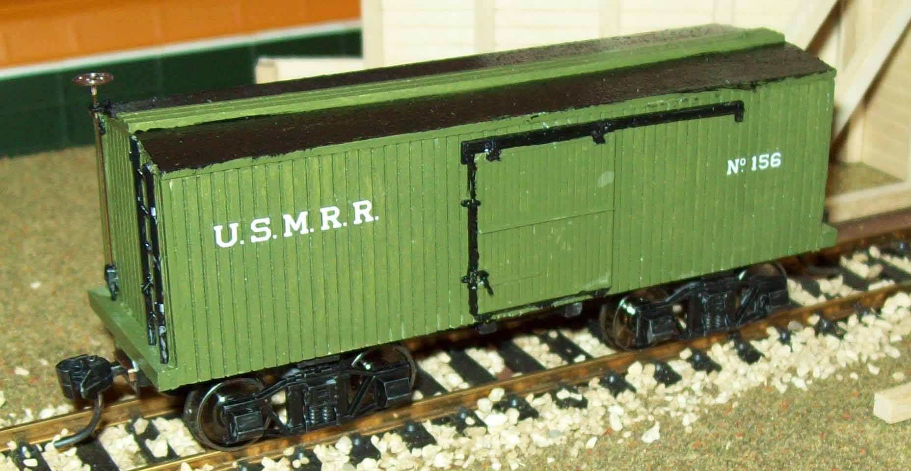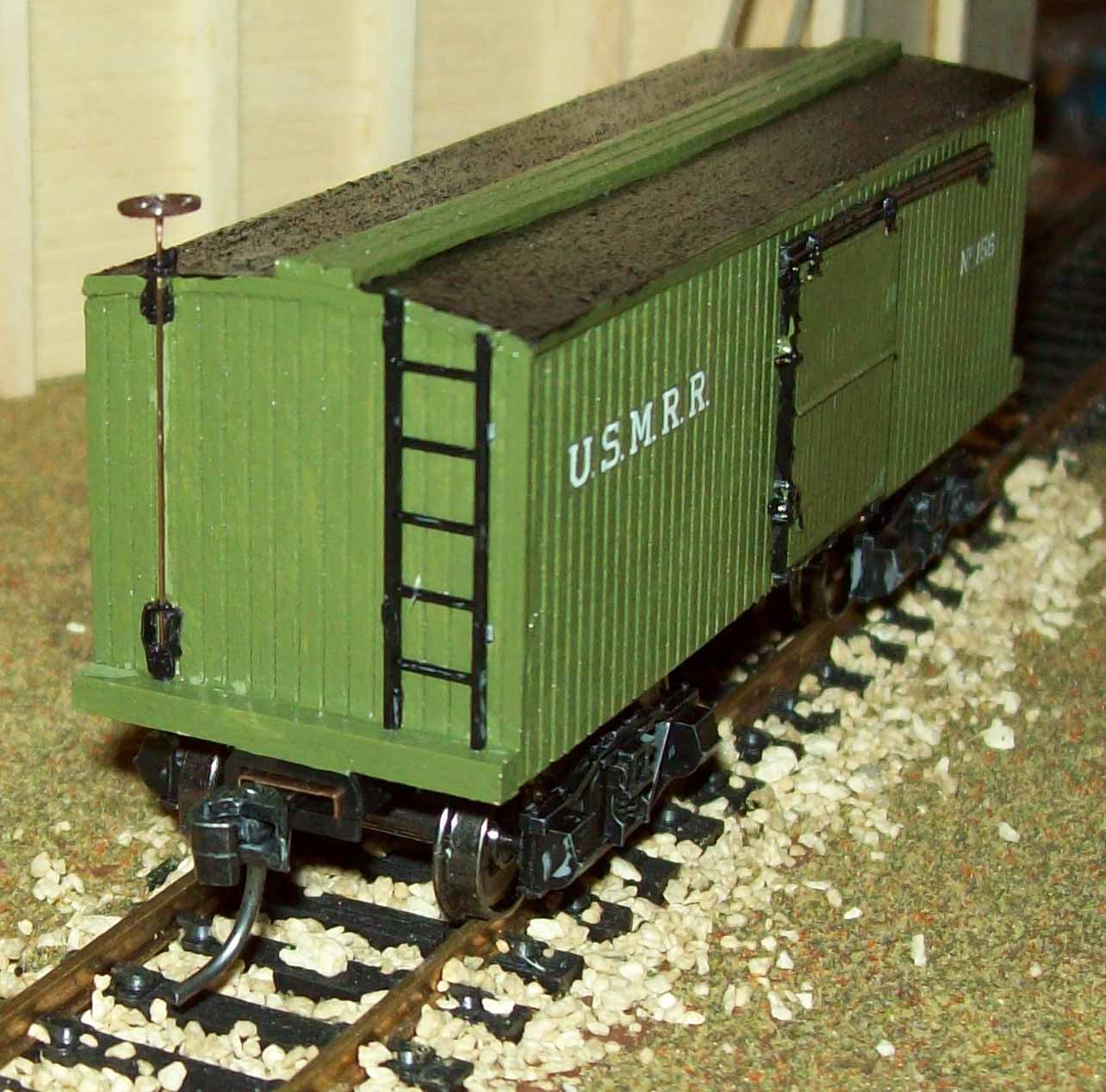 This weeks car is a scratch built USMRR 26' Boxcar from the 1860s. The plan was in a Model Railroader magazine.
