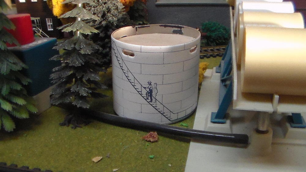 Think I got this oil tank from a card stock kit that was complete, but in a discard bin. I rather like the level of detail, inasmuch a card stock kit can have, including the shadow of the guy hiking up the ladder.