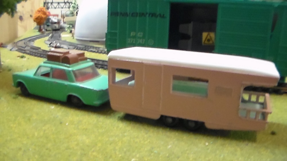 Got this wonderful pink trailer from RP Model Railroads (aka "The Shark Master") a while back on a trade. I had one similar to this when I was maybe four. The car, also part of that duo, looks like a Vauxhaul Dad had back in the day. The more I see the pink trailer, the more I like it- the interior detail shows up nicely here. Always great fun that Matchbox closely fits into HO scale.