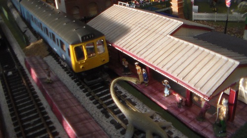 A Lima 3 coach Diesel Motor Unit, DMU, from a British Model Rail Forum in Wales. Here seen stopped unexpectedly by the Loch Ness Monster, who has crawled out of her moat.