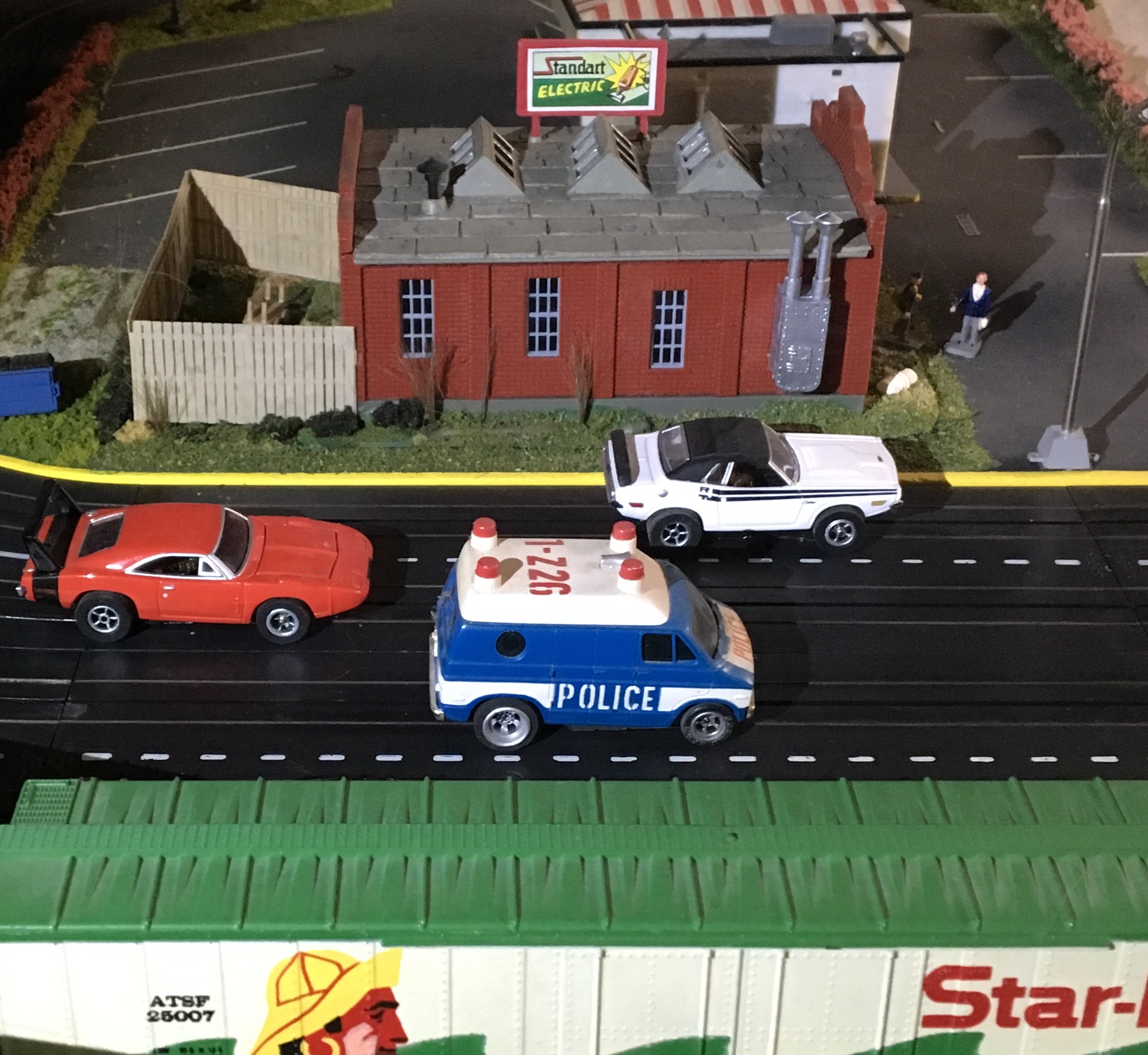 A repeat from the archives is the O scale (I think, or maybe S scale) Plasticville Hospital. The loose zoo animals chasing the medical staff out of the building was inspired by the Robin Williams's classic, "Jujami."