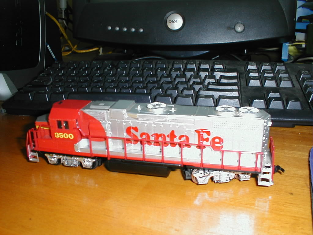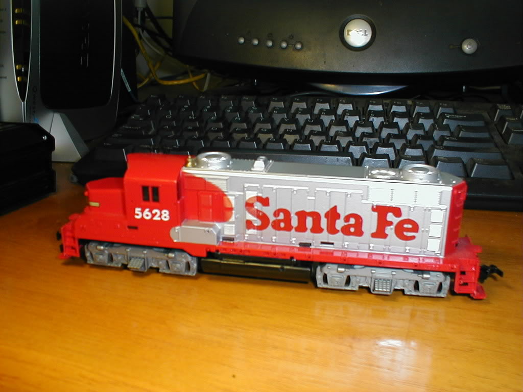 The Santa Fe engine with number 5628 is a Tyco GP-20.