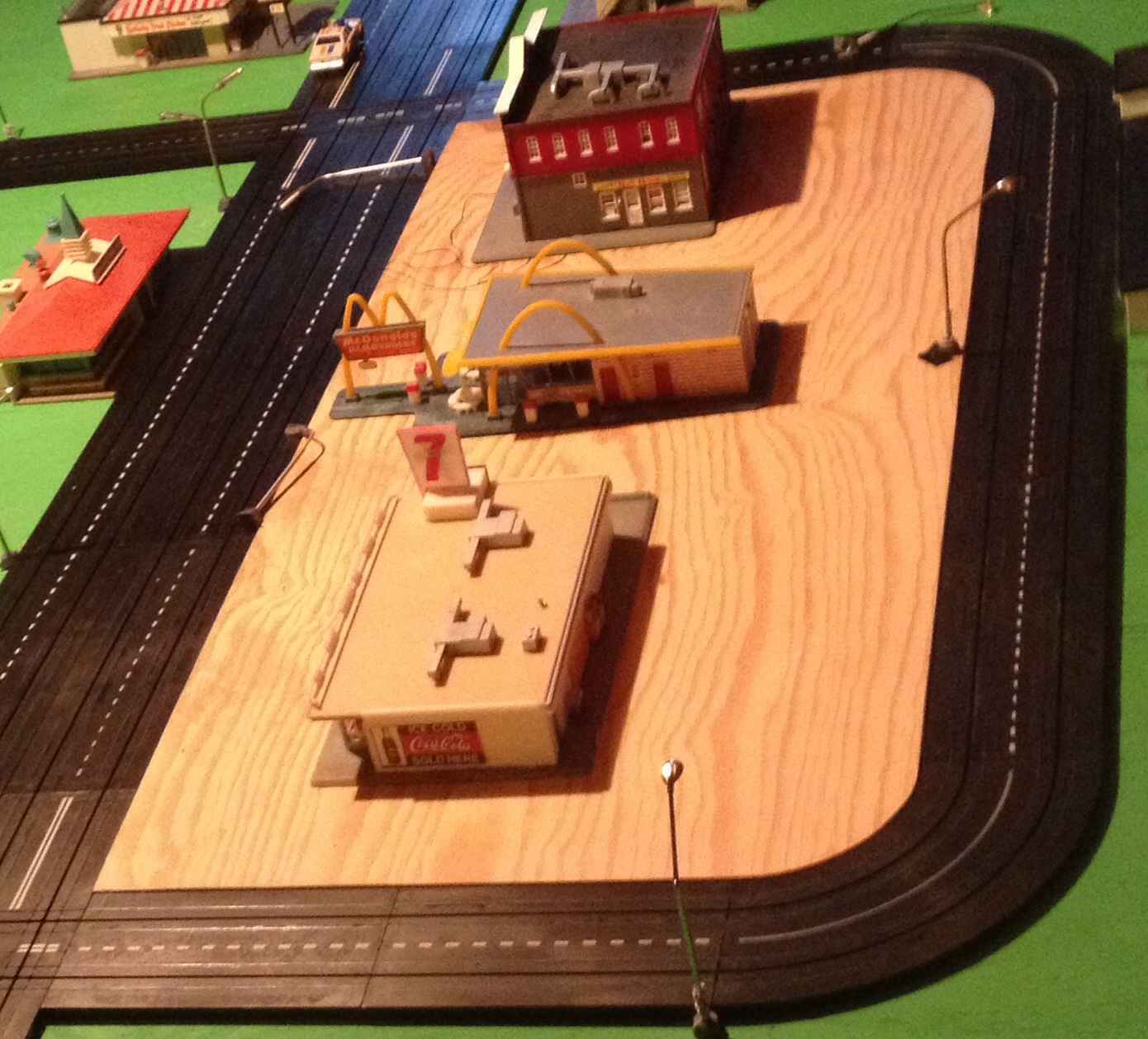 Glad to see that 7-11 is getting its deliveries from the ATSF in Walt's World! Nice pictures of a most innovative layout featuring slots, piggy backs, lights upon lights, and Tyco.