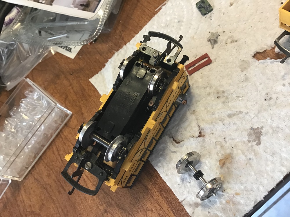 After years of fiddling, and no, every AHM motor and every other one in the scrap box, was a few millimeters too tall. Got this Tenshodo WB 31 power truck. Not a perfect fit; it was too short. However, by removing one geared axle, and replacing it with a spare gearless OO axle to clear the gear box, the ends fit nicely into the journal boxes after a little reaming with an Exacto blade. Now the power unit is all tucked inside the coach body. To compensate for the loss of a powered axle, an ounce of weight is being glued to the interior roof.