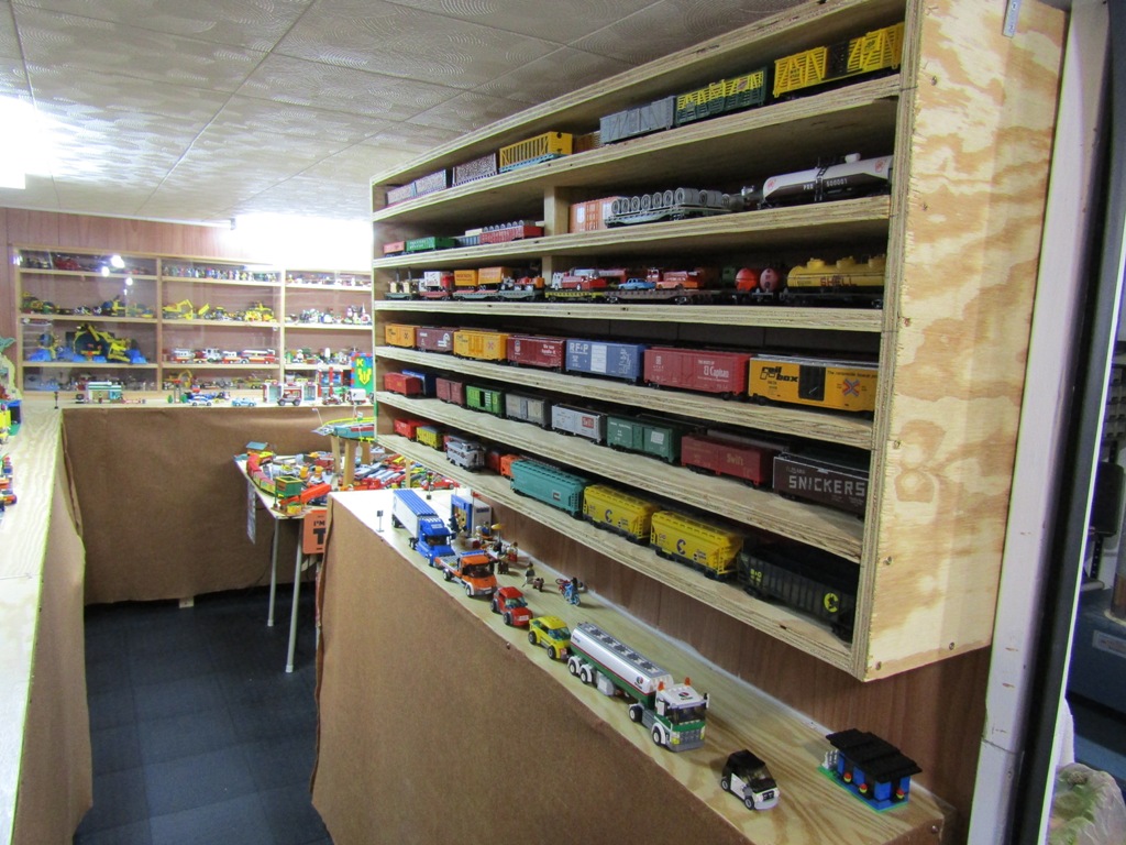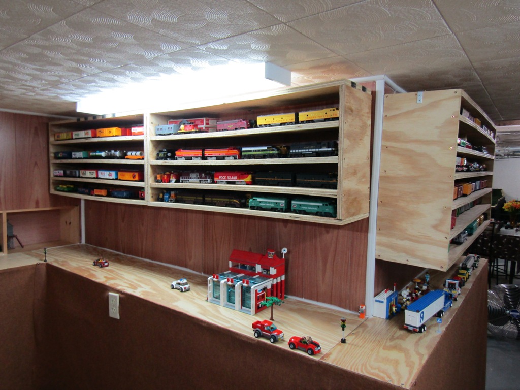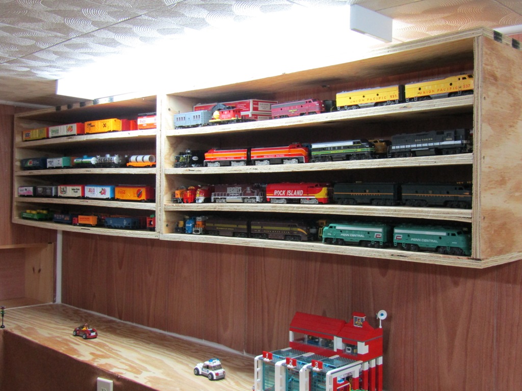 A few weeks ago, my Dad and I worked on assembling 3 shelf sections out of 3/4 inch plywood. While not perfect, these shelves are level, and have proved succesfull in storing all of my train cars and locomotives - allowing me to once again gain access to the tables within my basement room, and rebuild Lego City.
