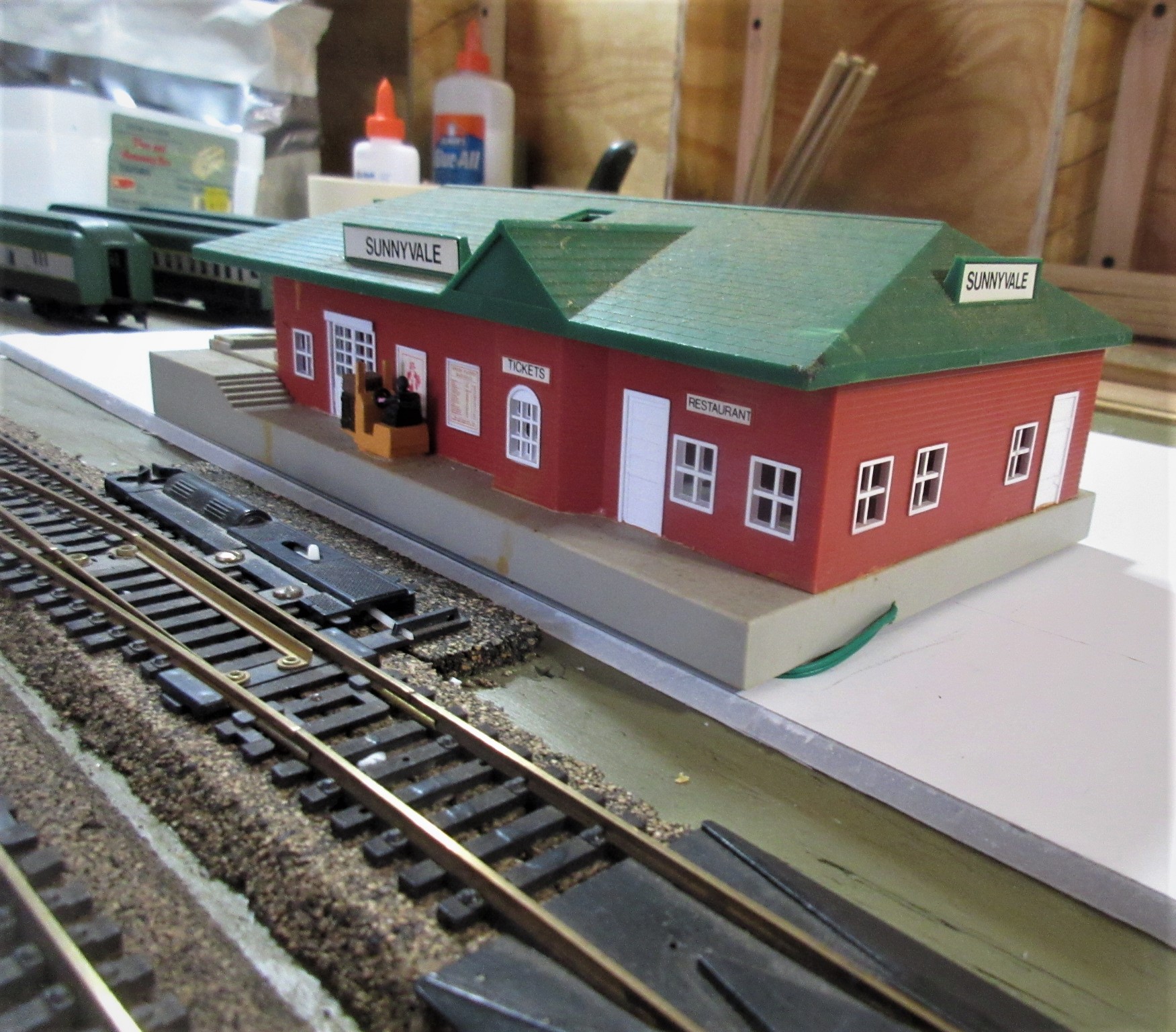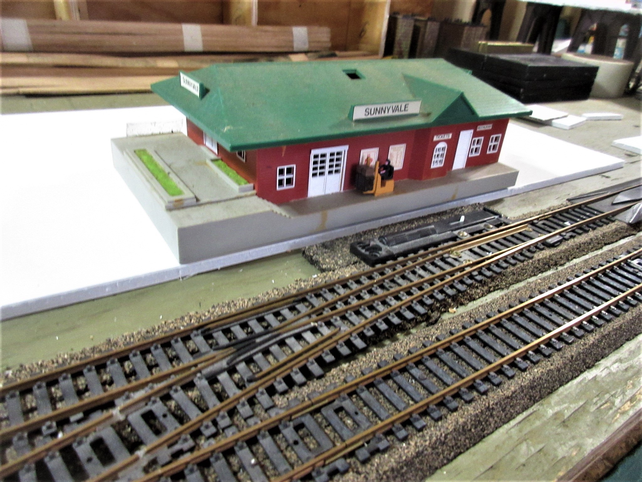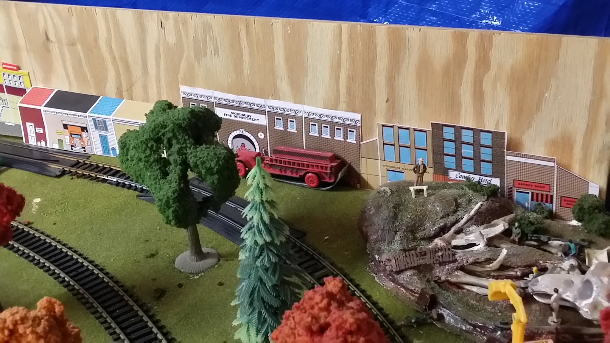 With a little help from RP...These paper cut out buildings are copies of the original "Tyco City." Really quite cool, totally vintage, they are made to be assembled in 3D. Lacking any space, I am using them to fill a back drop area on Armodilloville. Thanks, RP!!
