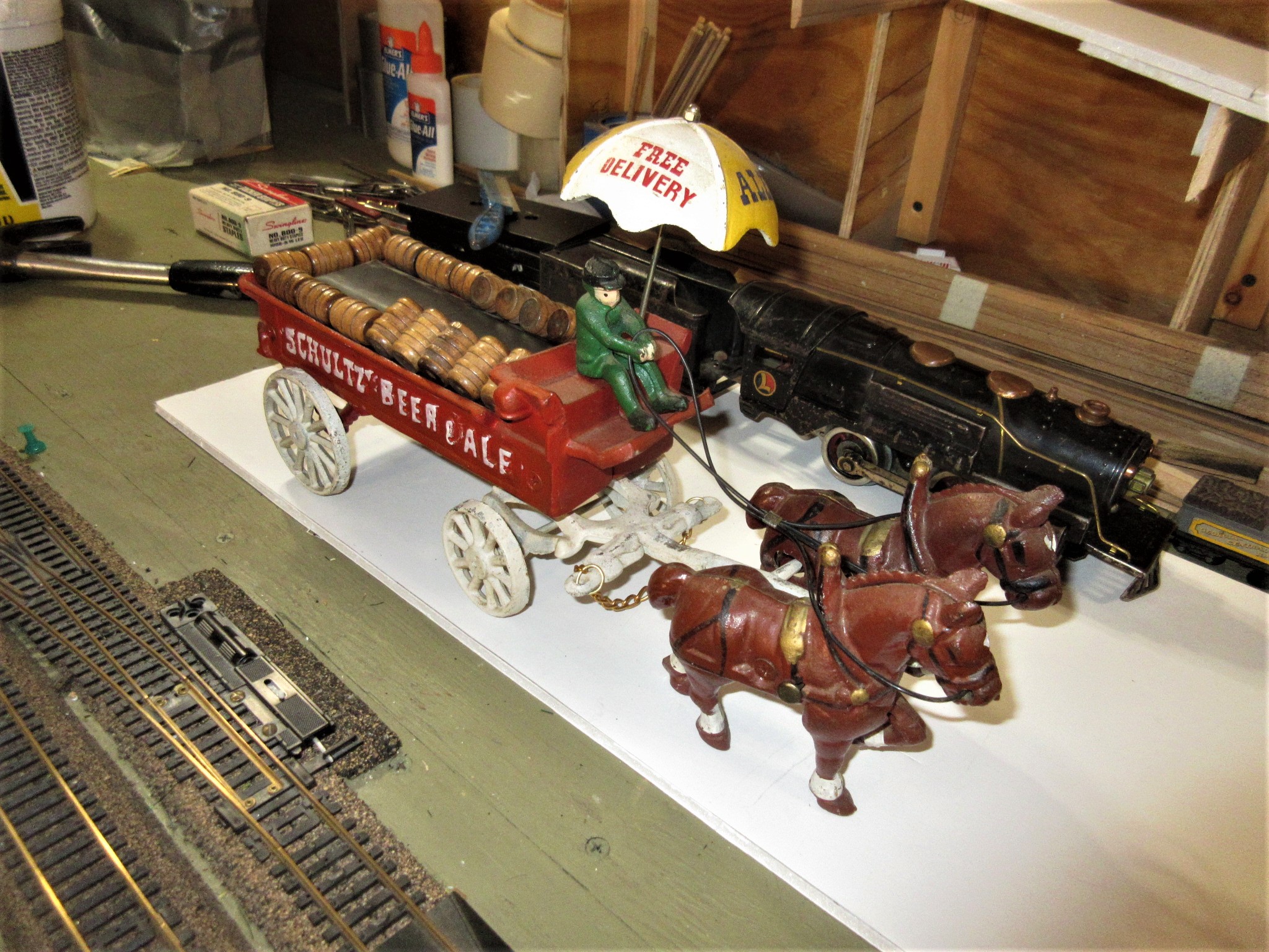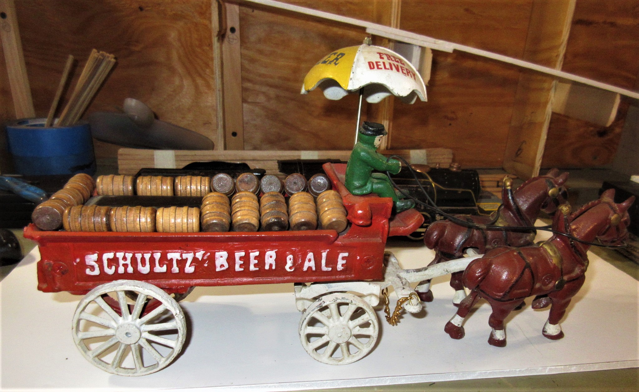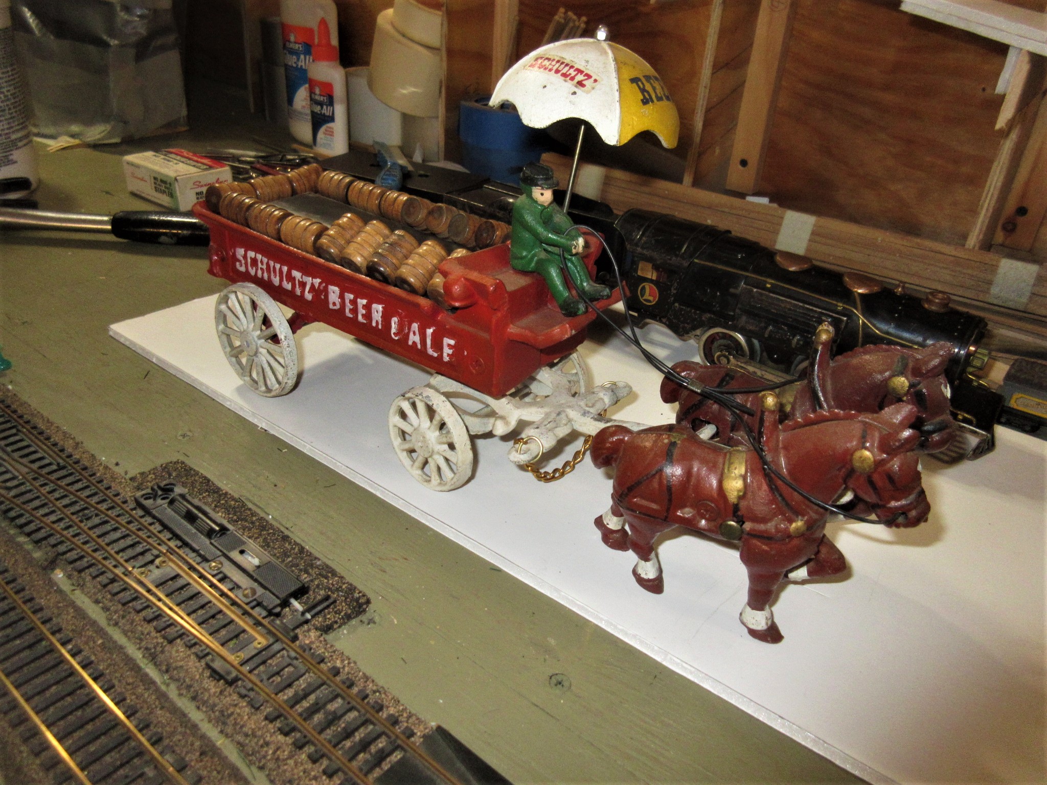 I got this today at the Wind Gap Flea market. It is missing a 2 wheel one axel lead truck. frank A G Scale cast metal Schultz Beer Wagon with driver nad 2 horses.