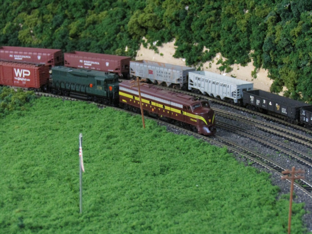 #1 - and the biggest problem with the Horseshoe Curve Branch Line.....the Dollar Store "black sand" ballast stone has been a curse for several of my N-Scale locomotives, which upon derailment, picked up some stones which wrecked the gears; essentially ruining some of my best locomotives. In fact, I pretty much gave up on operating the layout when my most expensive and favorite N-Scale diesel - this awesome Pennsylvania RR E8 - was ruined by stones which jammed and broke the plastic drive gears. In addition, the trailing GP30 in this photo was dummy-ized after it too was ruined by the black sand.