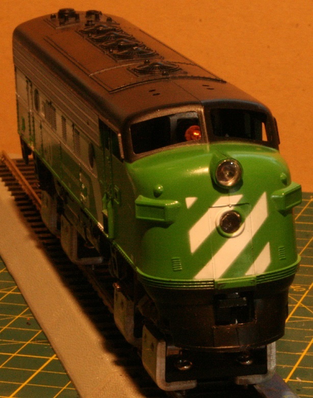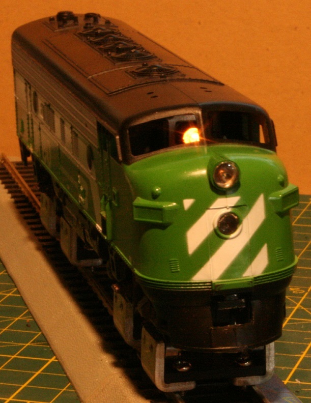 This Burlington Northern F7 is equipped with a conventional Athearn headlight lit by a half volt.