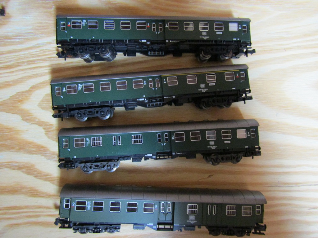 4 N-Scale German (DB) green passenger coaches -- the top 3 are Fleischmann and the last one is a Roco. "Let your light so shine before men, that they may see your good works, and glorify your Father which is in Heaven." - Matthew 5:16