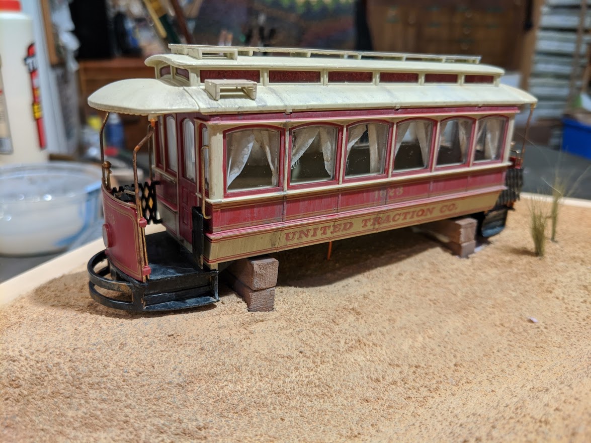 I'm creating a small diorama with a Bachmann On30 trolley (which is pretty close to what a horse car looked like) and added curtains and some weathering. I just need to add a couple of people.