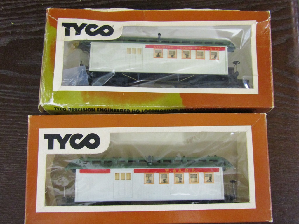 A "set" of 2 Tyco vintage passenger coaches - one is lettered for the A.T.S.F. while the other is W. & A. RR.