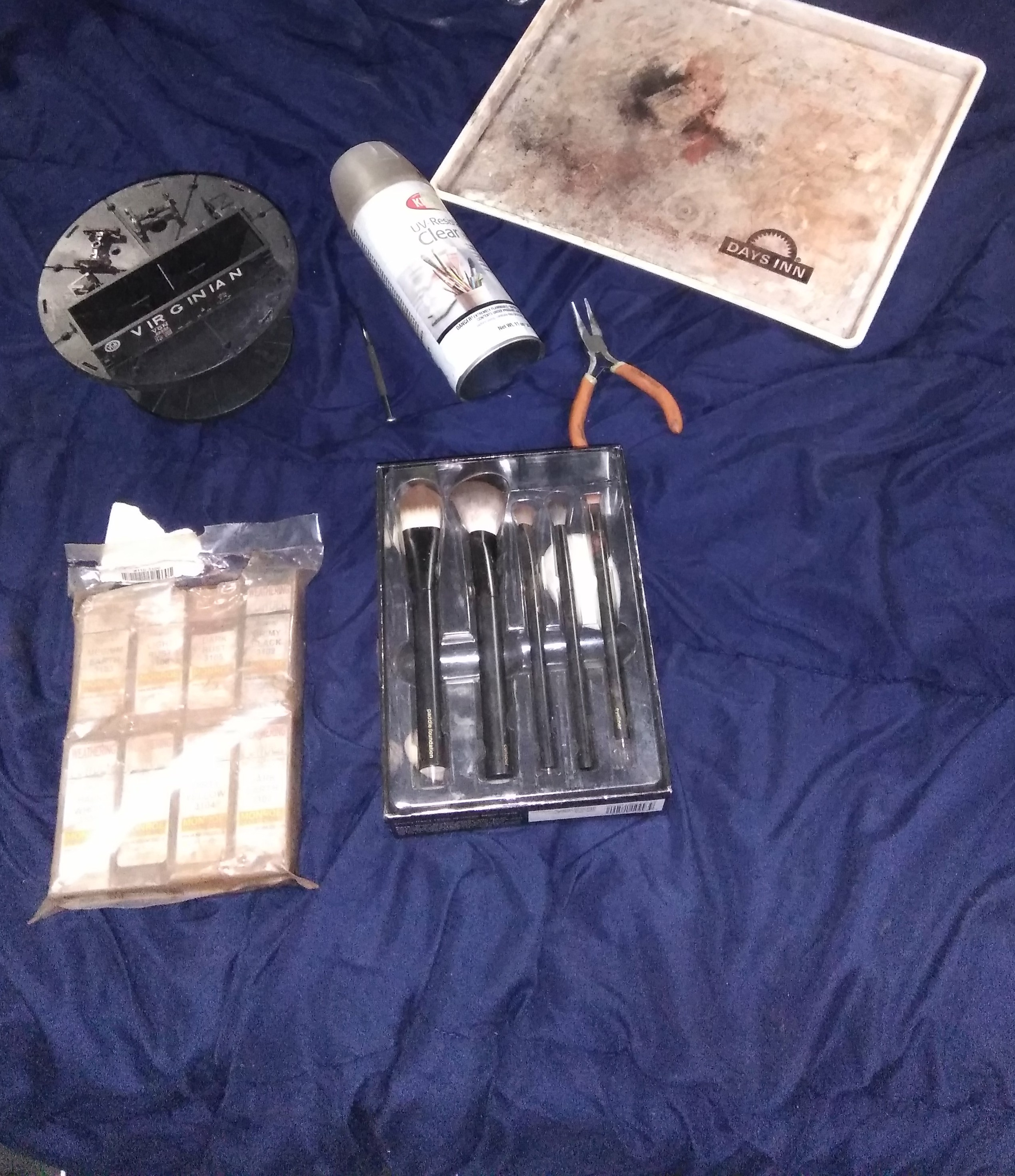 I wanted to make a post on how I weather cars and the techniques I use. I like powders because it can be scrubbed off. I use Monroe Weathering Powders because they're self adhesive and come in a variety of colors. I use a set of make up brushes to apply colors. It brushes nicely. I use the big brushes to spread out colors over the whole car. Such as grimy black. I use the smaller stiffer brushes to apply various colors to the car, trucks, wheels and couplers. I apply it and then gently make a dusting movement to spread it around to get a desired effect. Before you weather a car, wash it and let it dry. Be careful how you handle it. Finger prints will show! And no amount of powders or top coat will hide it. The weathering may look to be a bit much at first, but, sealing it with dull coat will tone it down a lot. Depending on what I'm after, I may add a second coat of powders. It's like a layer cake during the process of trying to get it where you want it. I like to use dark rust on the trucks and some light rust on springs and a very gentle dust coat of it on the truck. It gives depth to the truck. I do every car different as a whole fleet of real cars is different from one to another. I like to look at prototype photos as a guide. Some other tools I may suggest are helpful. I like using the Tamiya turn table set while I apply the top coat. I like to use bent needle nose pliers to hold small parts. I acquired the tray years ago and like to use it for the job because clean up is easy. I like to use Model Master paints because it's water based and goes on nicely. I like to paint the weights of cars to match the body. Especially Athearn cars. The powders will not stick to bare metal such as couplers and wheel sets. I use a yellow micro brush to apply these. When I weather wheel sets,I like to paint the face of the wheels tie brown. I then use a q tip and rubbing alcohol to remove excess paint from the tread. Let it dry. For roller bearing style trucks, I suggest dark rust. For friction bearing trucks, I suggest grimy black. I also suggest grimy black as a very light coat of weathering to tie in everything on the body of the car. It'll blend everything in nicely.