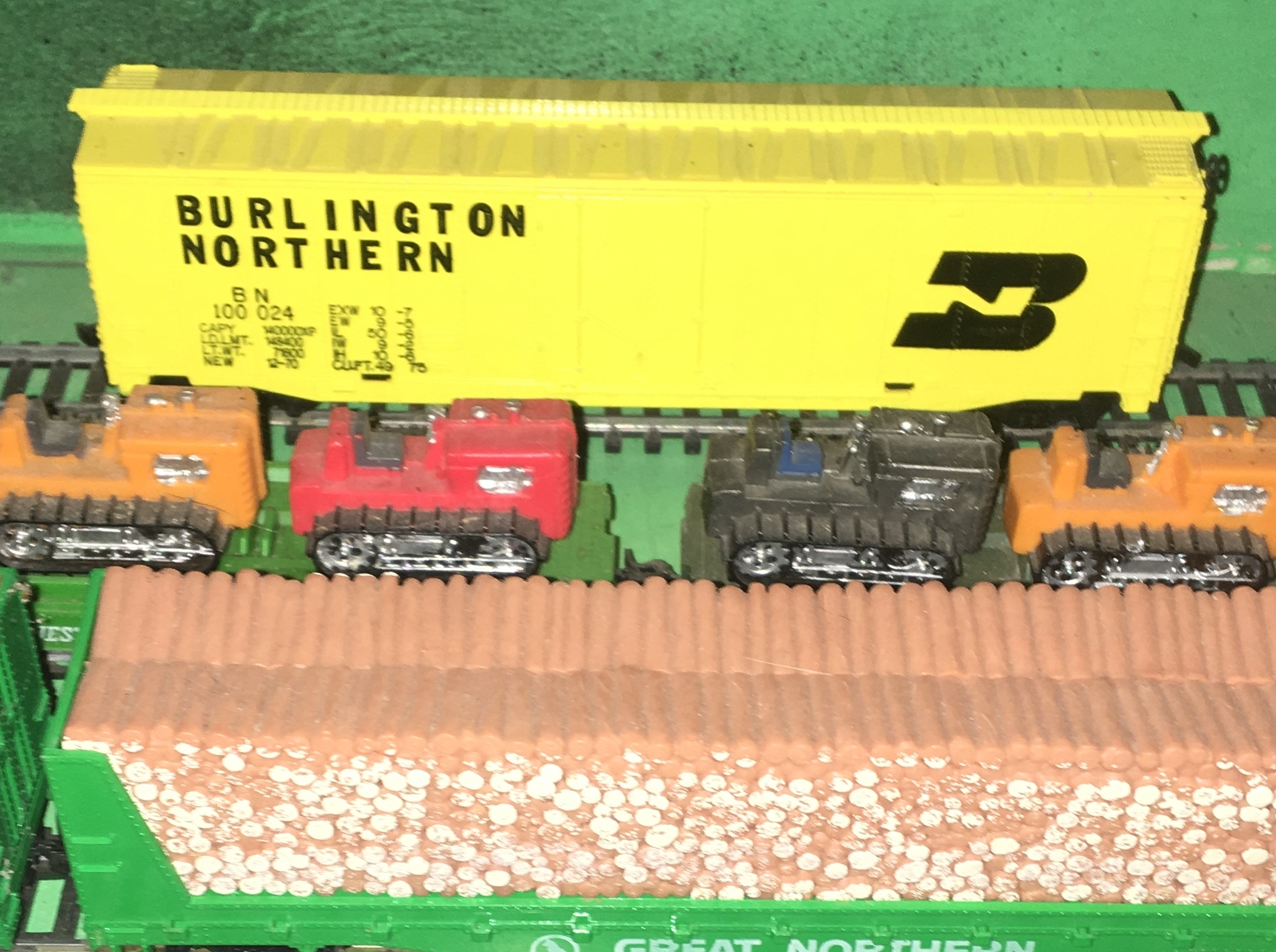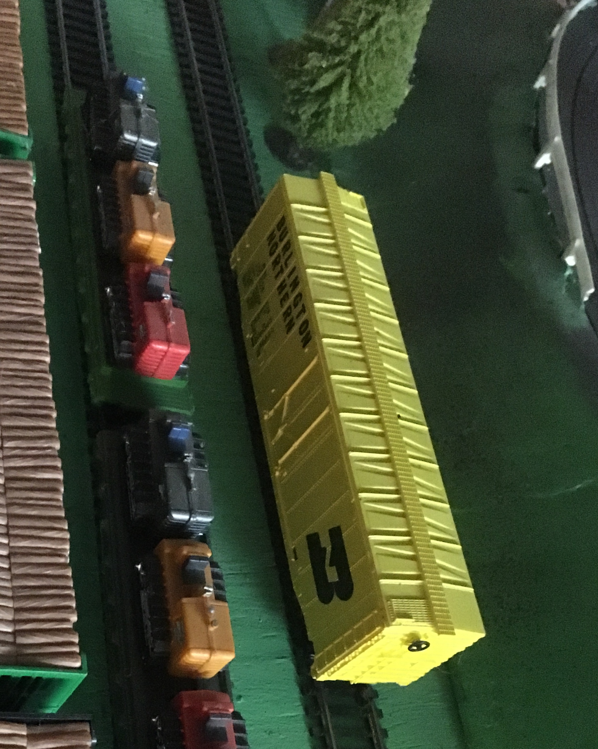 Here's the Tyco yellow BN box car. Not real common as the green one is. I like this piece for whatever reason... Pictured in a seldom seen area on my table, in photos... This photo is along the edge where I just added the 20 feet. With this 20 foot rail, I have a total of 60 feet of straight side track. That is room for 90 of the 8 inch hoppers, box cars etc.