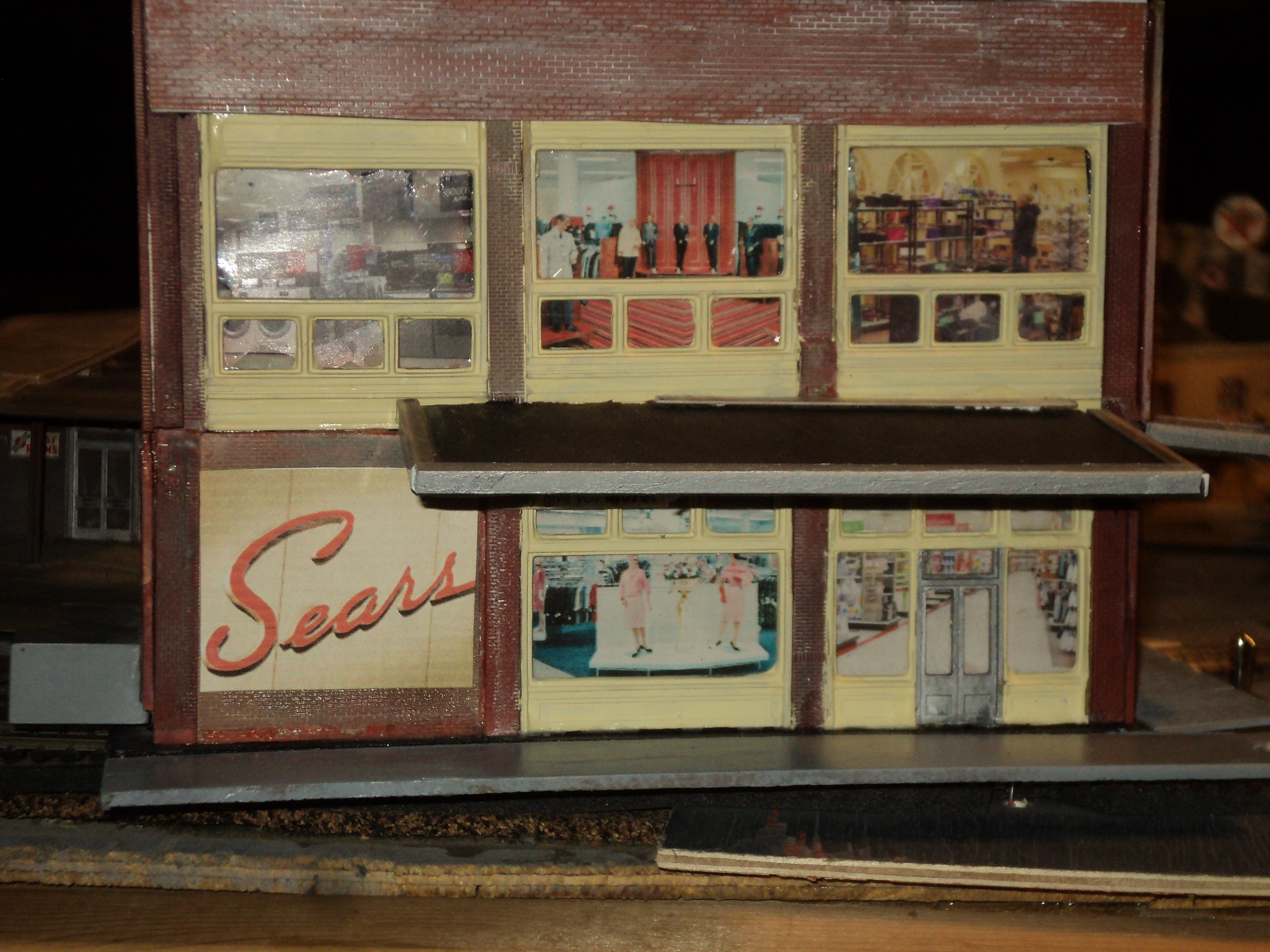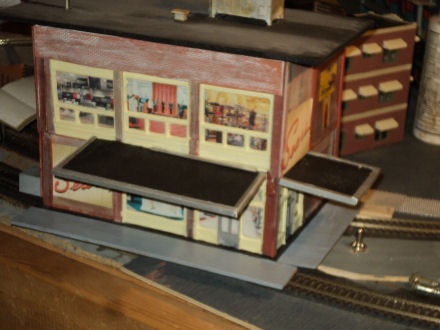 Here are some more buildings on my layout out since I reworked it three years ago.Some are buldings that I hadda resize or make smaller because I added more trackage to the layout itself .This is a Sears store I built years ago that was on the original layout from years ago.Had to take it apart and rebuild it smaller to fit the spot I put it in the town.This was a three stall car repair house That I cut down to a two stall because of needed space and added trackage in my yard.Exstremely proud of this because it was my first wood kit build,actually my 2nd the first was this same kit that i destroyed some of the wood needed to build it.But I took my time the second go around,read up on as much info as I could find on line and it came out alright.And yes it has a few tyco amc javelin's parked in front of it.