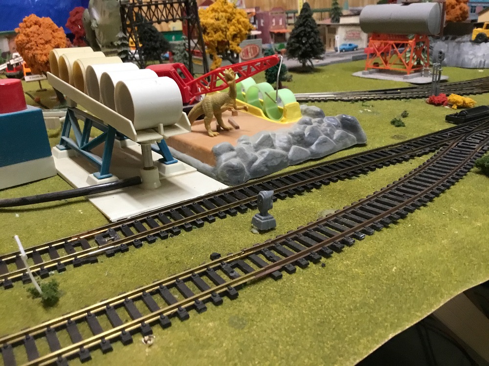 Armadilloville has had several permutations, much like Glacial Drift, but the prerunner was an attempt of the doing a copy of the track work on the Tyco Layout Expander. I never liked it once I got it up, the switches tended to foul trains, and the inner loop was to be so small, and hard to get into that eventually the Tyco Muse laid her hand upon me and said, "go with a overlapping double oval." That design is really easy to work with, doesn't challenge the trains to derail, and has lent itself to an easy 4x4 extension.