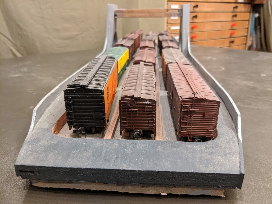 It's made of plywood and I still need to make the bridge cabin. There are no rails. I use it simply to store cars. It can hold up to 12 of them.