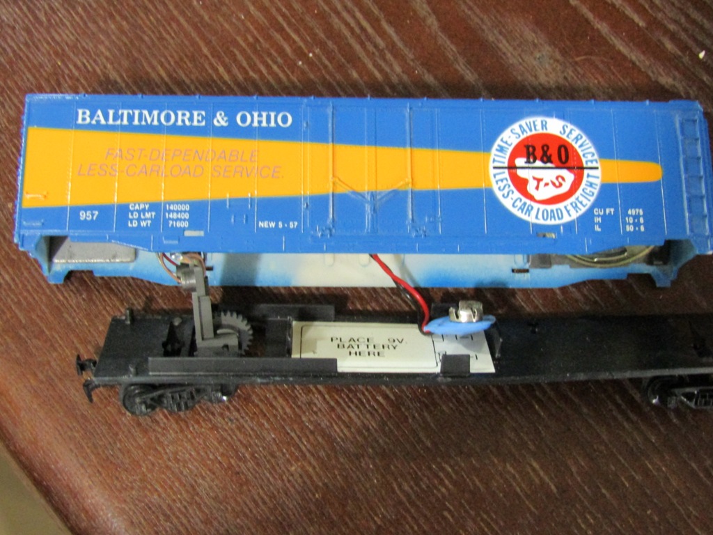 My COTW offering is the Tyco Sound of Steam 50' box car, which I got in excellent condition for 15 bucks, shipped. Unfortunately I don't have any 9-volt batteries to test it yet, however, to my understanding, the battery powers a speaker system which is all hidden inside the box car, and there are gears attached to one of the trucks, which of course spin along with the wheels as the box car moves down the tracks, and somehow synchronizes the sound system with the speed of the steam locomotive. I really can't wait to test this out, as I've seen at least 1 YouTube video of it in action and it works great.
