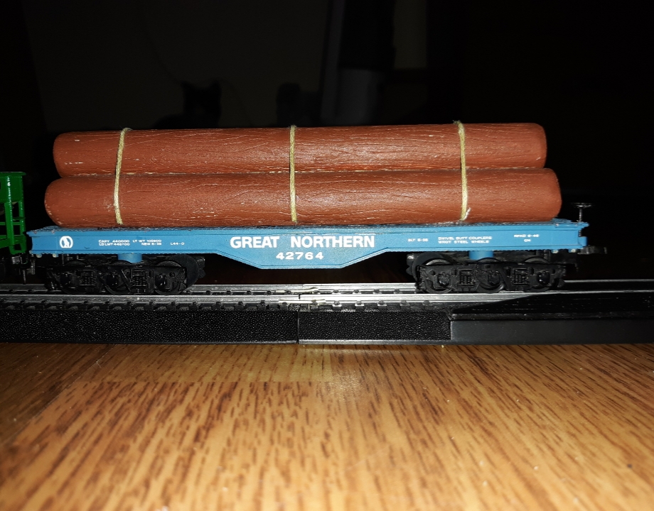 I also have this Bachmann Great Northern Log Car. This particular car does not have the cleanest track record for me though. It sits too high, leading to trains breaking apart. It also has a tendency to wind up like this: