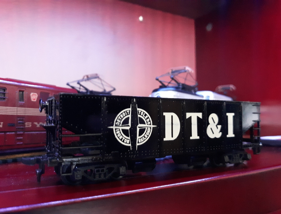 Here's my Tyco DT&I operating hopper, which I got in a mint set for around thirty bucks. I don't know what it is about this car, but I love the glossy paint job on it. The only pitfall is the coal load in the set was not the gravel load shown on the box. The 'coal' was about the size of a grain of sand, so I just left it in the package. I knew it would've been lost in the carpet in a minute flat. I love the car though.