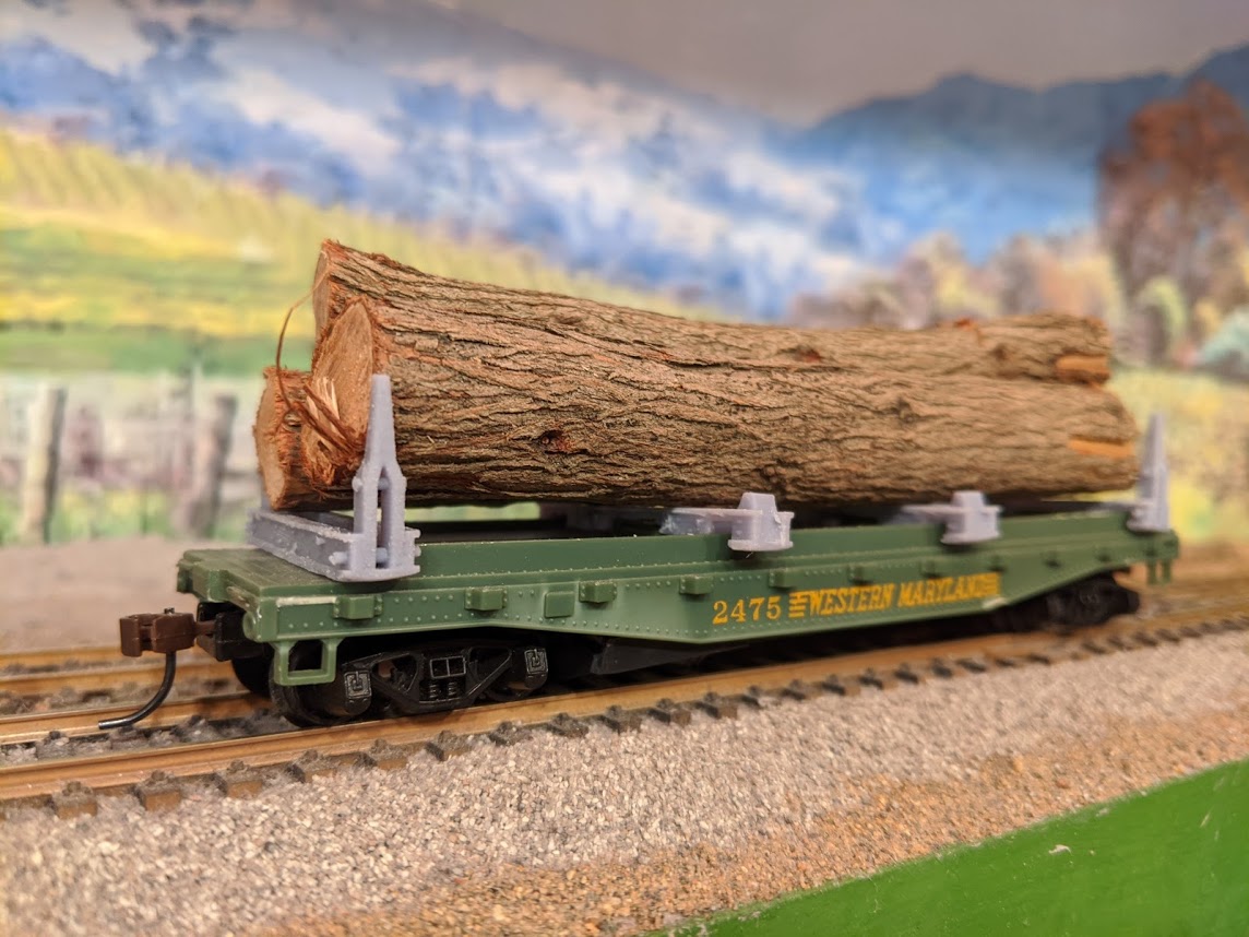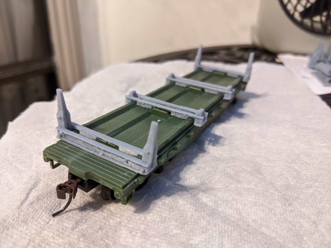 I've been playing around with Sketchup and my 3D printer and I came up with these bunk pieces for the skid flatcar. I created them last year and set it aside to work on other things, and now I picked it up again. I'm still learning how to print them to the proper size. The middle two pieces turned out a bit too wide. I plan to paint them black.
