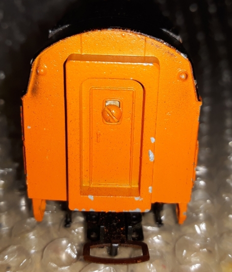 Now, it is possible that someone down the road took a plain diecast Shark shell, and painted it to resemble the original black over orange scheme, hence the overspray which looks a lot like airbrush or spray paint, and if they did, they were spot on with the striping. This is a theory, that I don't believe. Seems like factory quality, from that age, which changed big time a decade later, or less than a decade really, with improved factory paint, plastic train shells, and more attention to detail.