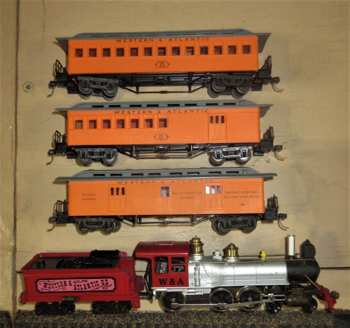 Heres a old time Western and Atlantic passenger set I made up of a Tyco W&A 4-6-0 and 3 AHM old time passenger cars. frank
