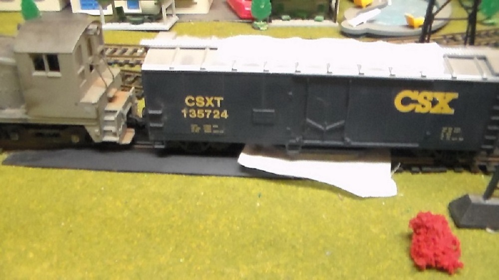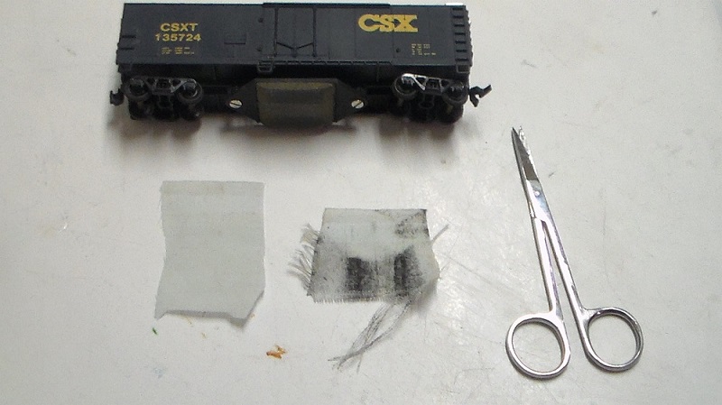 For the longer reaches involved in Armodilloville and Henley I use this Model Power box car with its abrasive block covered by a square of linen rag, and it really does the trick. I can mop up residual oil with a dry square of linen either in tandem or seperately.