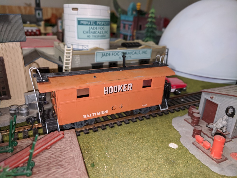 I believe this to be an Athearn piece. Just got done adding end rails and ladders from the junk box. Best I could do. I realize, from the photo, it really needs some "windows." Parked on the Jade Fog Fog spur. A shipment of Fogite ingredients due soon.