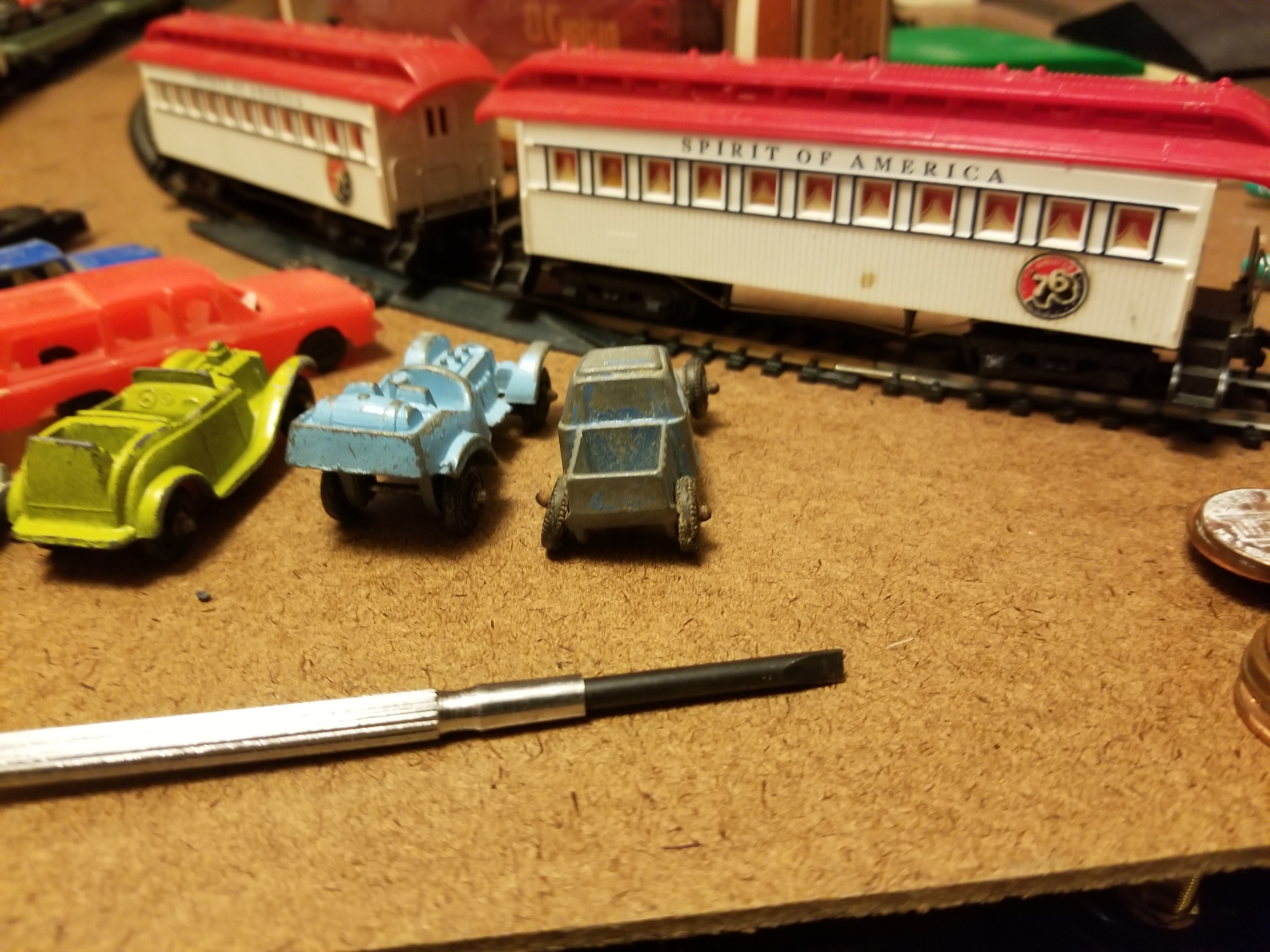 | Tootsie toys most cool, I’ve never seen the pick up. Wonder where they made those, and out of what? Really nice coaches. Good luck on the hunt for the locomotive. Be careful you don’t get a junker, might be worth to pay up for NOS, return policy, or better yet, at a train show.
