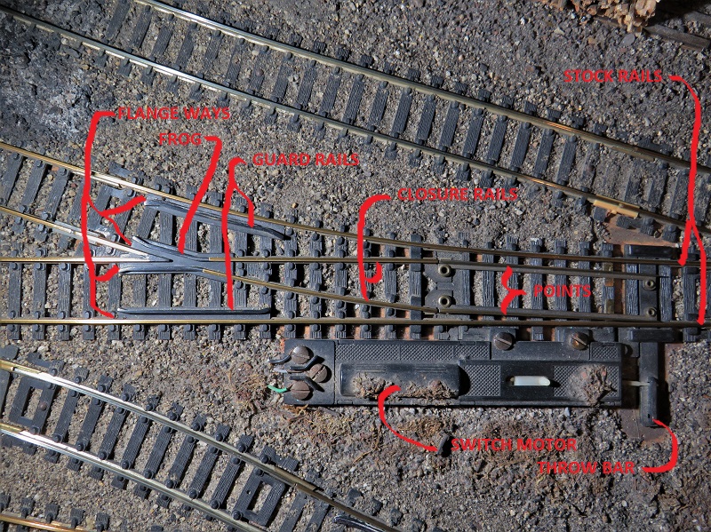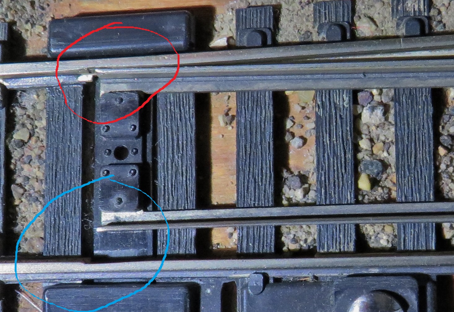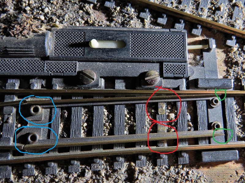 The blue circles indicate the rivets on which the points pivot. They are the electrical path to the points and can corrode a bit leaving a dead point with plenty of opportunity for your locomotives to stall. When I install a turnout, I'll let some automatic transmission fluid seep in between the moving parts to prevent corrosion.
