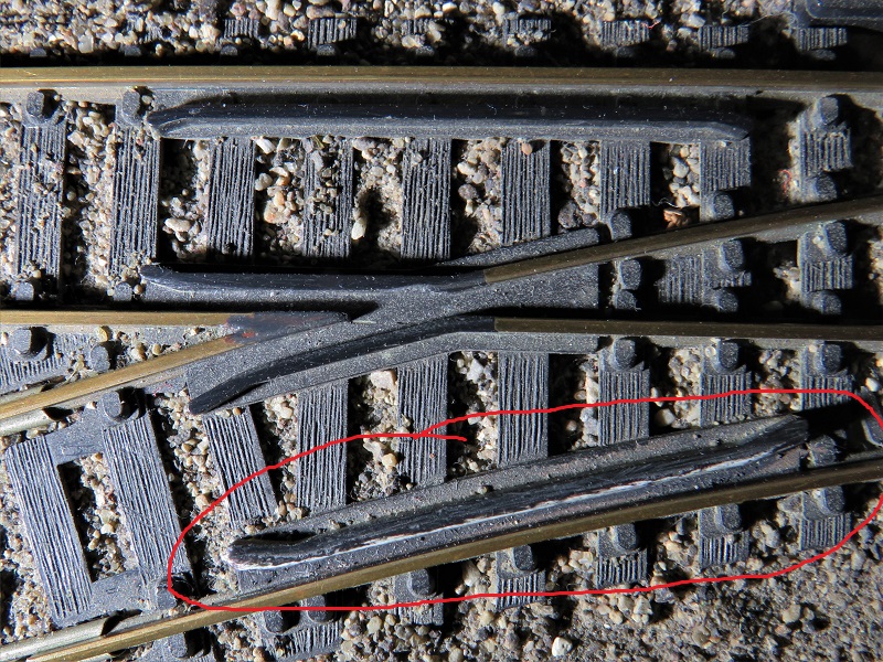 In the red circles are some brass shims, glued to the tie. The points can be lower than the stock rails so that the outside edge of a wheel will catch the inside edge of the stock rail and be pushed to the side rather than rolling onto the stock rail from the point. The shims raise the point to match the stock rail.