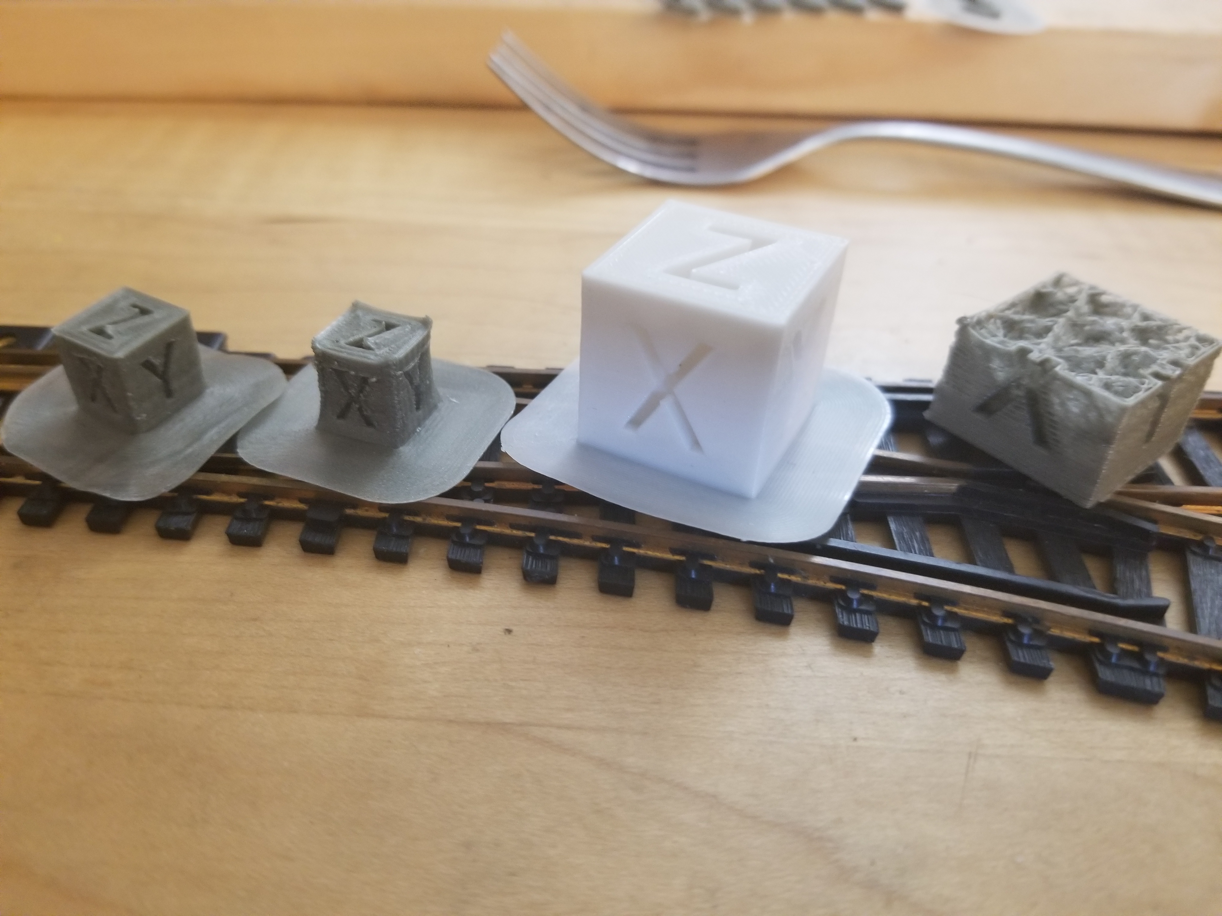 test prints below far right was from last night this morning did a lot of cleaning and got the white one to work, trying black plastic now so I guessed bad filament (I hope not) so I put it in the "fine detail" printer(just installed new tiny nozzle today)) and printed a test block at half size which had the cooling fan plugged in backwards causing warping(2nd from left) so then I printed again and realized it was set to high speed printing, causing vibration shadows so more tuning, then testing, then back to printing