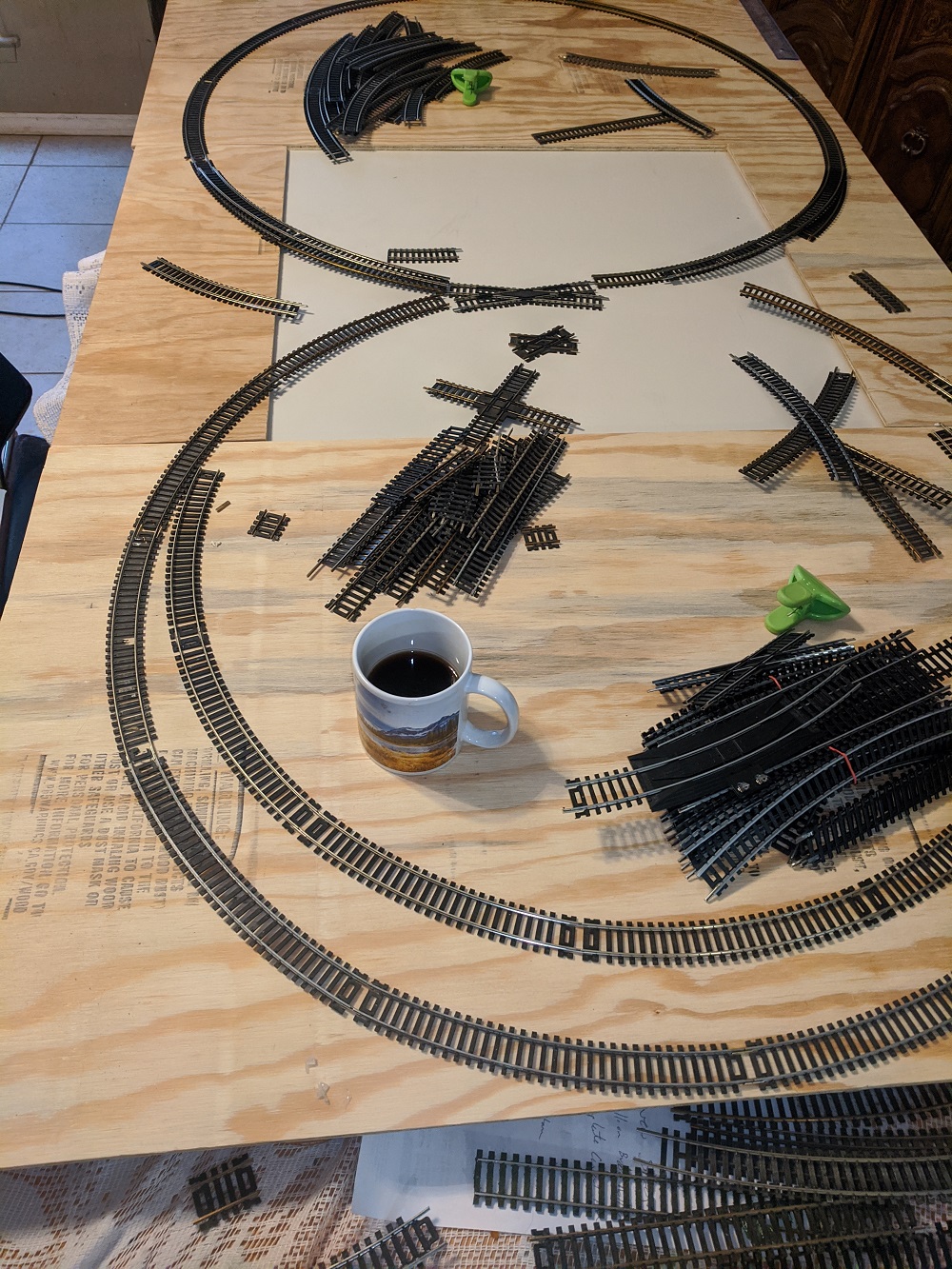 After rearranging 15 and 18 inch radii half the night, and half the day, I remembered that this crazy Mehano set I'd bought a while back came with not only a complete set of figure track, but also a track plan to go with it. I pulled that off the shelf, and using the track plan as a guide got down to laying down sectional pieces to creat an 18 inch radius figure 8 for the lower tier. Low and behold, even working off a factory track plan, the second loop of the figure 8 was about a full nine inches wider than the first loop, which fit nicely.