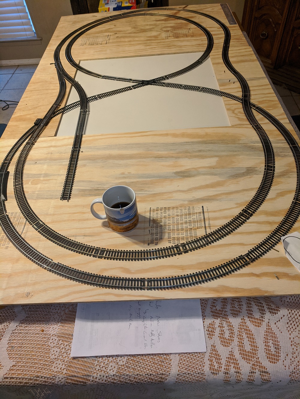 Nice Chops I like to keep thing pretty simple too no grades on my layout. Not to be nit picky but is that a slight kink in the track where the orange cap is by the scented candle I am seeing? One of the techniques i use is to take pictures of all my track work after laying, the camera finds everything I may have slightly out of alignment