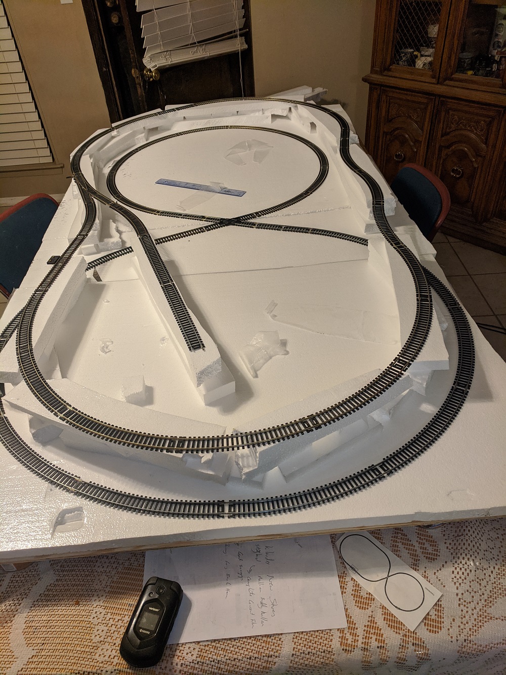 OK, put in some initial foam runners for the upper level. The Jupiter is 2 inches from rail head to top of stack, the runners bring it in at 3 inches. The left overpass will be a tunnel, the right gap a trestle bridge, but will probably extend the length along the sinuous curvature.
