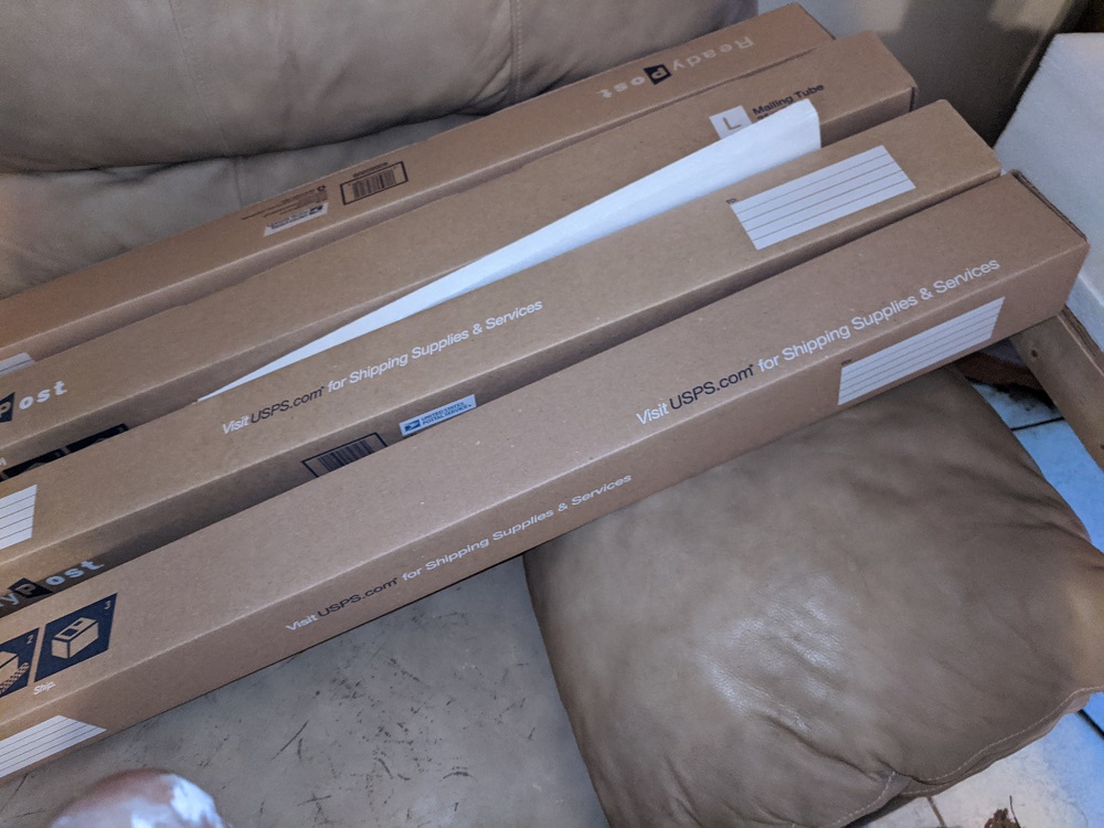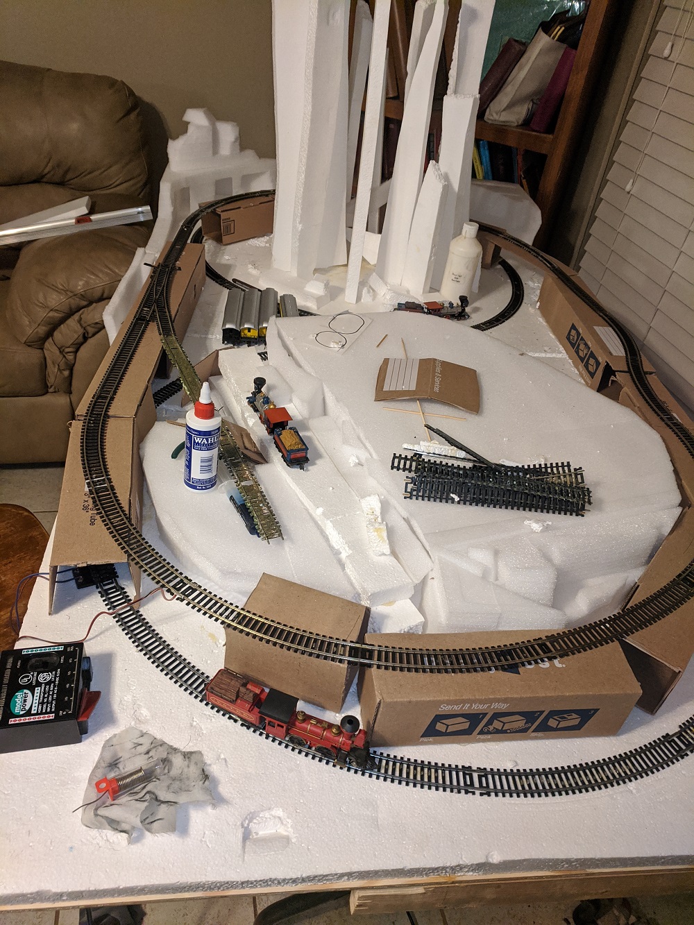 One step forward, two steps back. First, had to strip off the upper layer of track. I was hasty and the uneven sub-base would not allow a train to remain on the rails. Very hard to trim the Styrofoam packing, which was free, to the correct depth, and the fumes were nasty. While standing in the Post Office, I spied these poster mailers. The measure out at three inches by three inches, the exact height I need for the crossing over the lower rails.