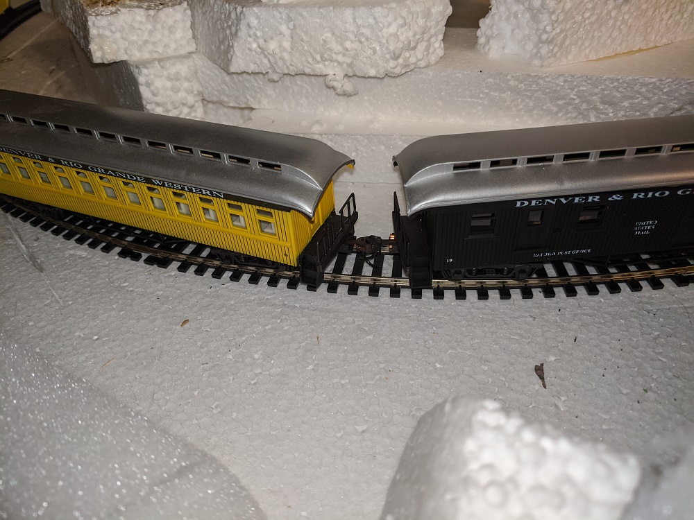 Next issue were these AHM coaches, that would not track for a nickel. I tried weighting them down, and they still derailed, and little American could barely pull two of them. Thought maybe metal wheels would help, then realized the wheels were already metal. Upon careful examination, the problem was the horn hooks that were stiff and created a bad lateral stress that pulled them off the rails at every corner. Usually, I steer clear of Kadees, but I had some extras in the junk box, and they allow an easy lateral transfer through the curves and no more derailments, and no additional weight is needed.