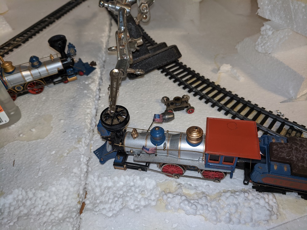 I tried to open up this Bachmann Jupe, and as typically happens with these Bachmanns, I soon ended up with a bunch of parts. Here I am gluing the stack back on. I was trying to see if the boiler had any space at all for a little more weight (it does not, not a millimeter). Fortunately, I was able to get it all back together and working again.